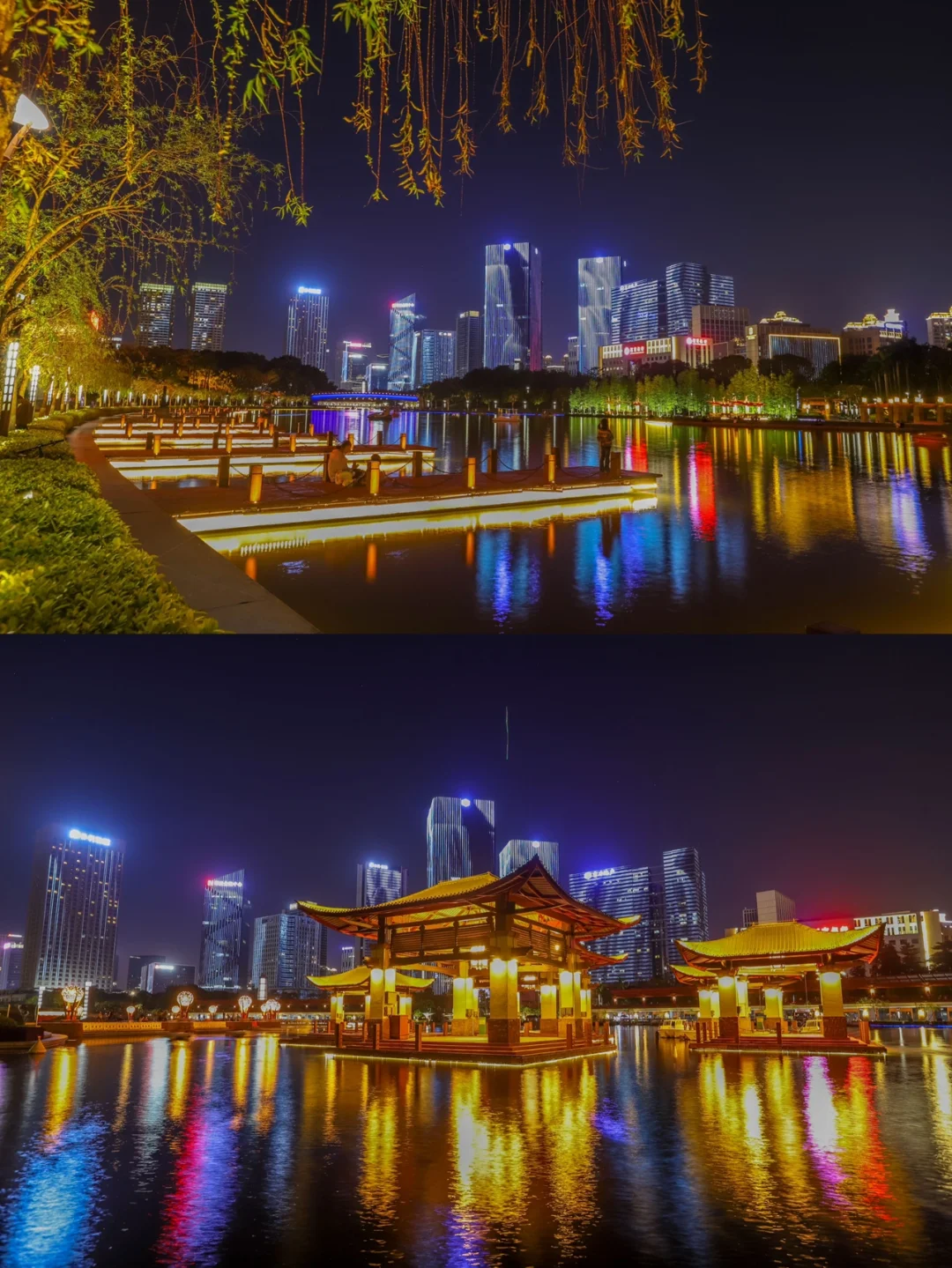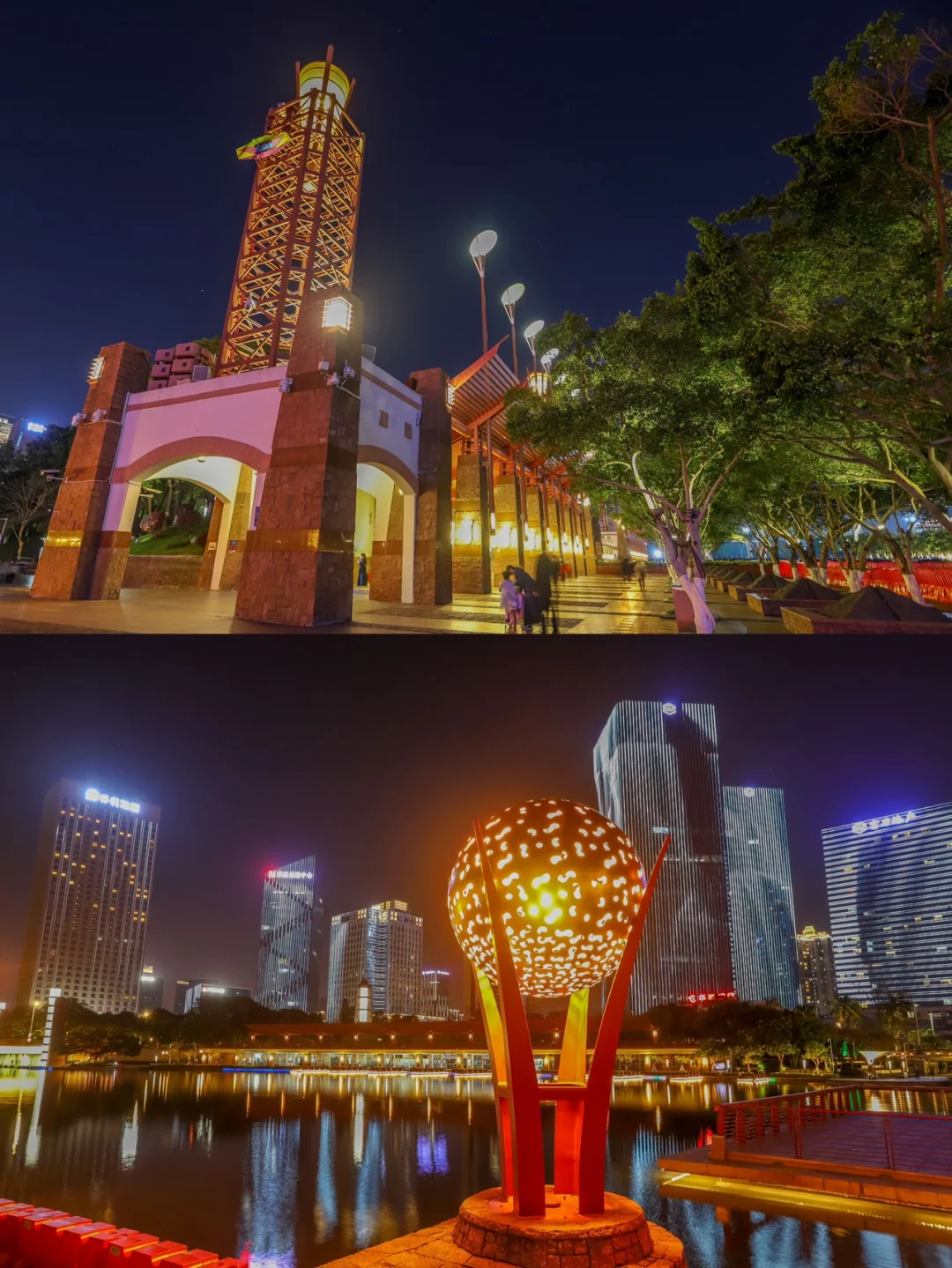 千灯湖的灯光秀,每晚上8:00~9:30每半小时都有展演,场景非常的宏大,由公园里面的塔灯、柱灯、廊灯、射灯等上千盏灯,和附近高楼里的灯墙组合成,千灯竞放的壮观场景。