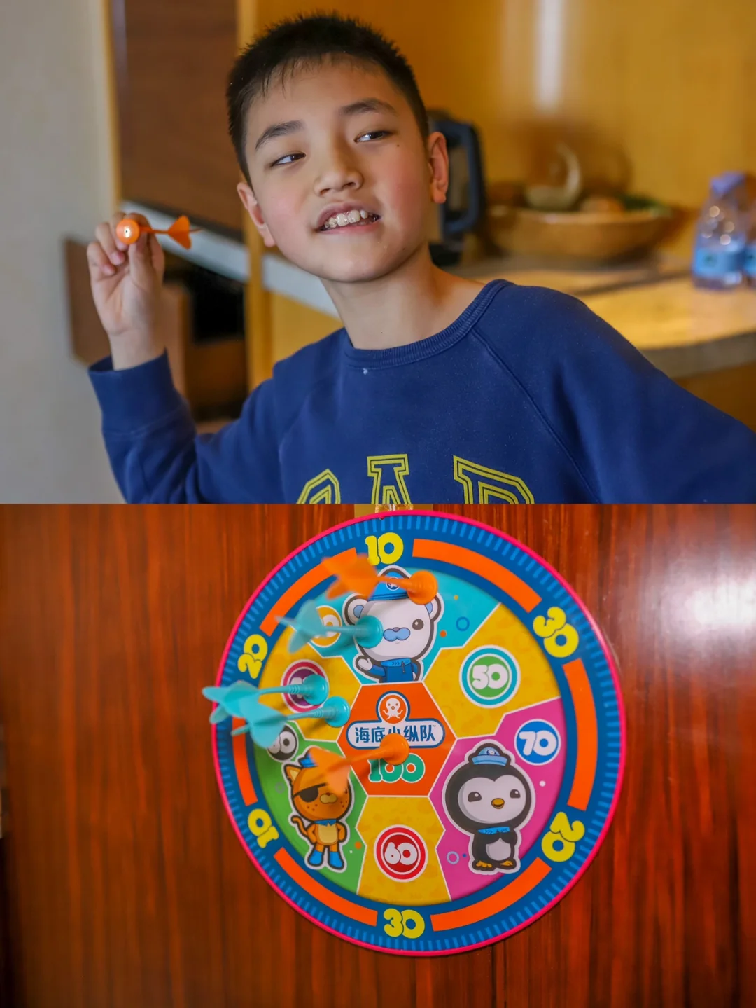 房间里有供宝宝玩的滑梯和秋千、海底小纵队飞镖、企鹅等海底小纵队形象的玩偶。