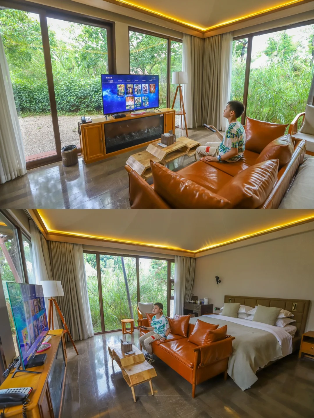 森林营地内有房车、帐篷、野奢别墅等多种房型,我们这次体验的是野奢亲子房。