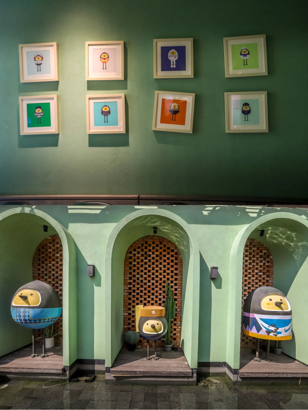 餐厅的装饰是浅绿色的小清新风格,里面布置了很多小鸡旅行的墙画,很适合小姐姐们拍照。