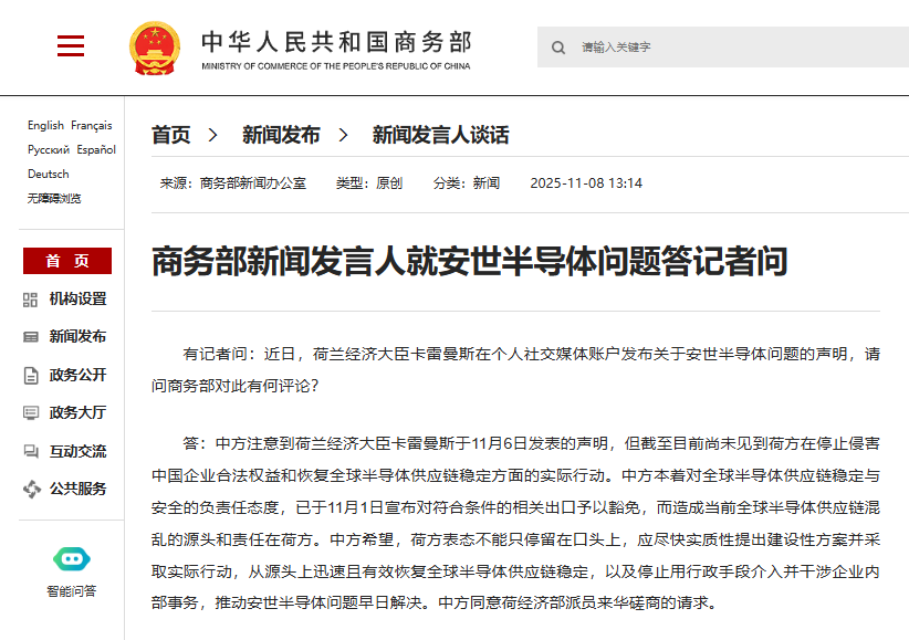 据商务部网站8日消息,商务部新闻发言人就安世半导体问题答记者问。