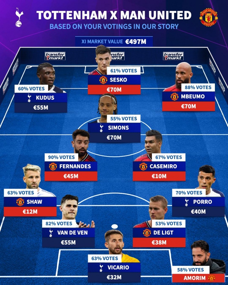 直播吧11月8日讯北京时间今天晚上20点30分,热刺将在英超第11轮比赛中主场对阵曼联。德国转会市场根据关注者的投票列出热刺+曼联阵容,B费、舍什科、西蒙斯、范德芬在列。