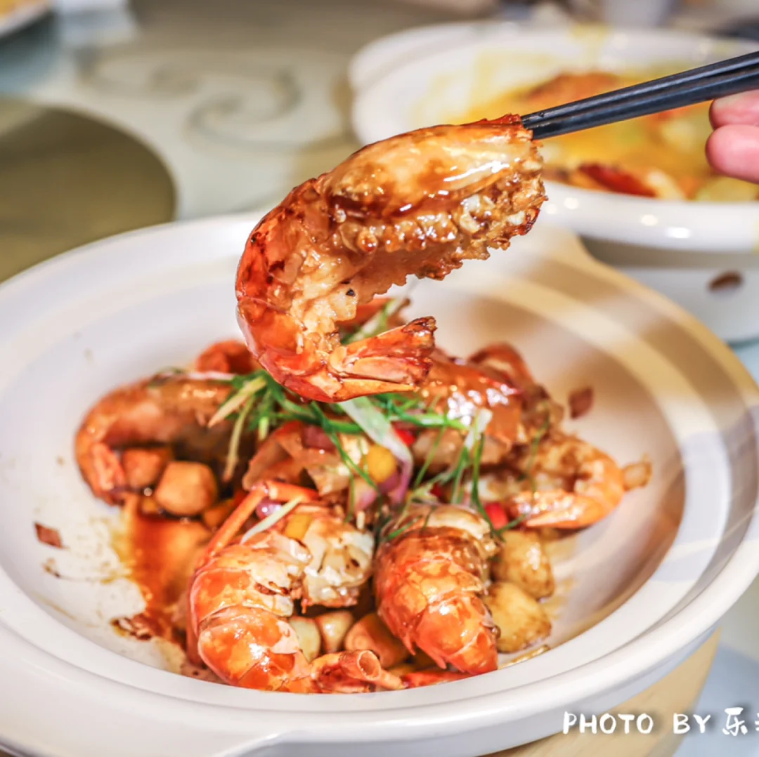 砂锅煎焗大罗氏虾,虾身硕大无比,肉质鲜嫩、味道鲜美,超级棒。