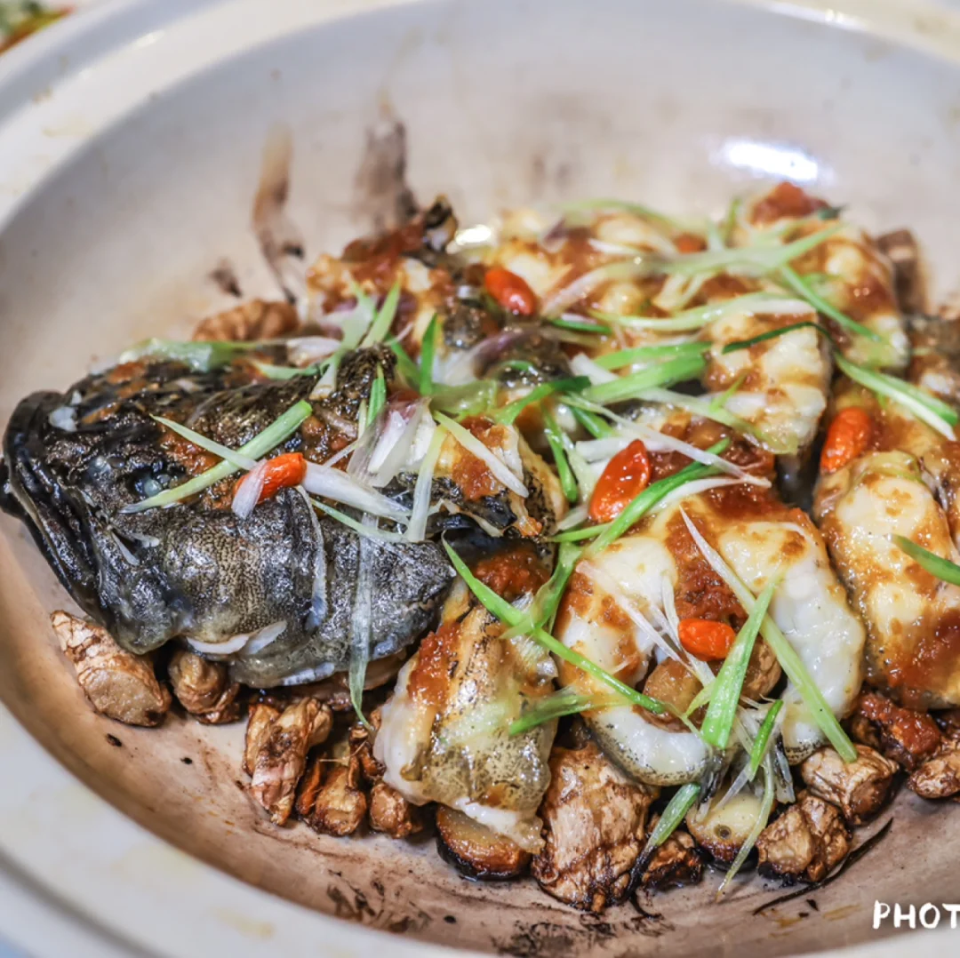 姜豉汁焗龙趸,锅底铺满沙姜除腥,鱼肉切成块状,滑嫩,入味好吃。