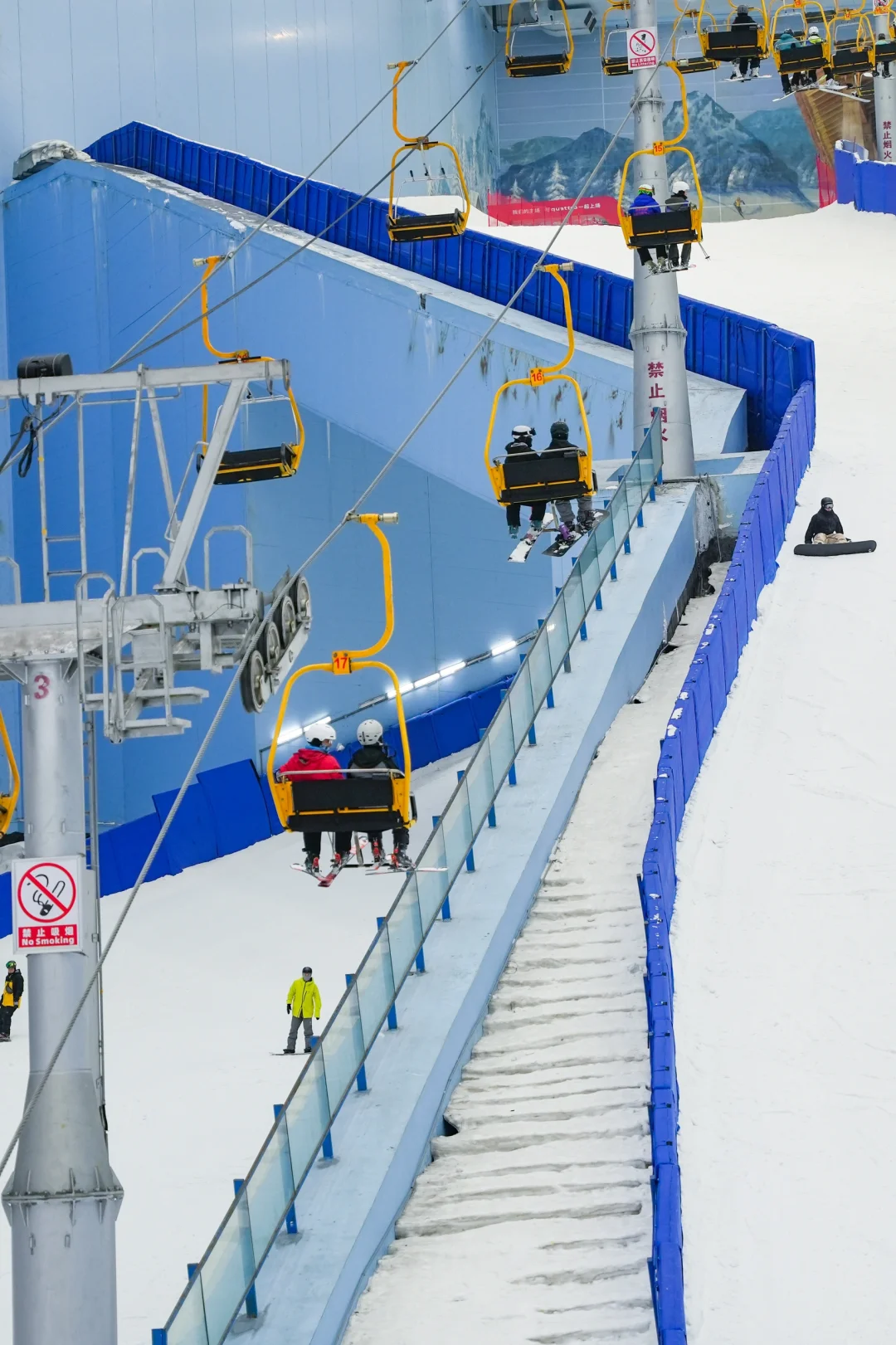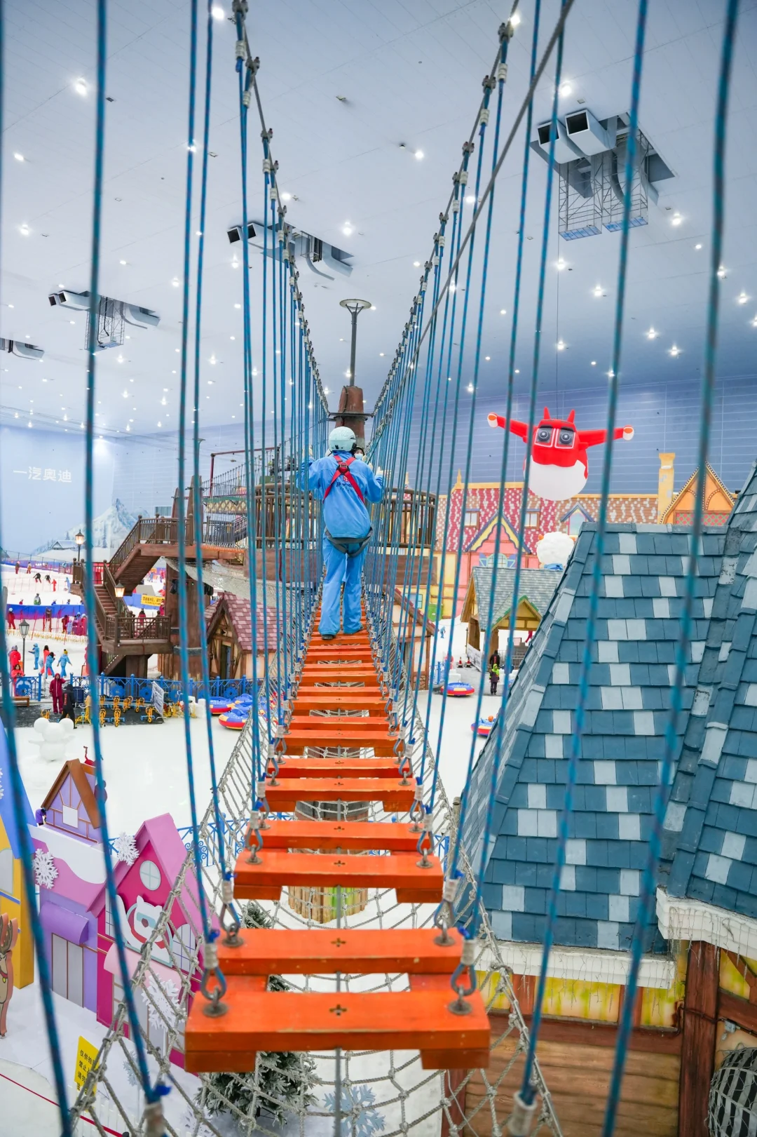 这里是一个室内雪乐园,充满了冰雕、滑雪场和各种冰雪活动。
