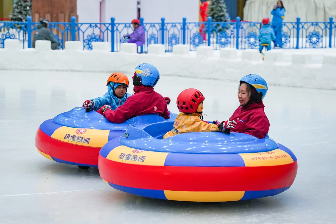 娱雪区,滑雪道适合亲子同乐,大人和小孩坐在轮胎上,一起比拼速度,看谁最快滑下来。