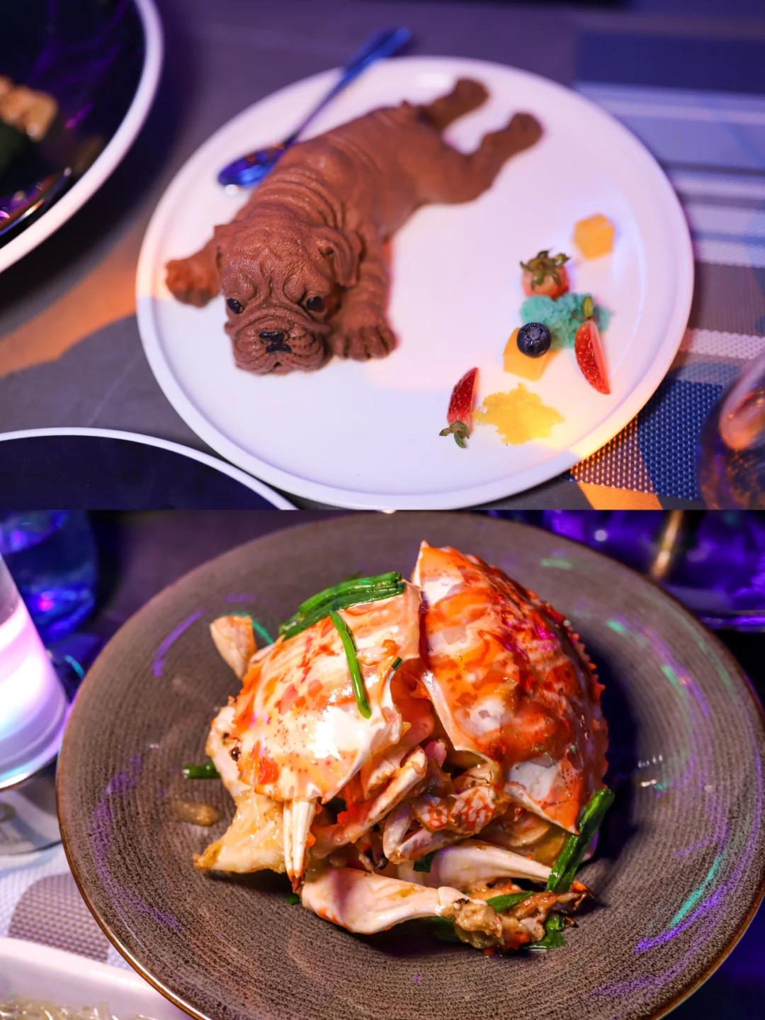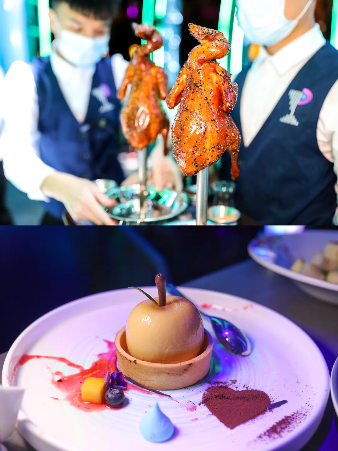 推荐奇亚籽钢管鸡、法式鹅肝、炭烧牛肋排、沙皮狗皮巧克力、从摆盘到口感都很精致。特别是钢管鸡皮脆肉嫩,上菜时,还有一个点火仪式,整只鸡都被火烧起来,好看又好吃。