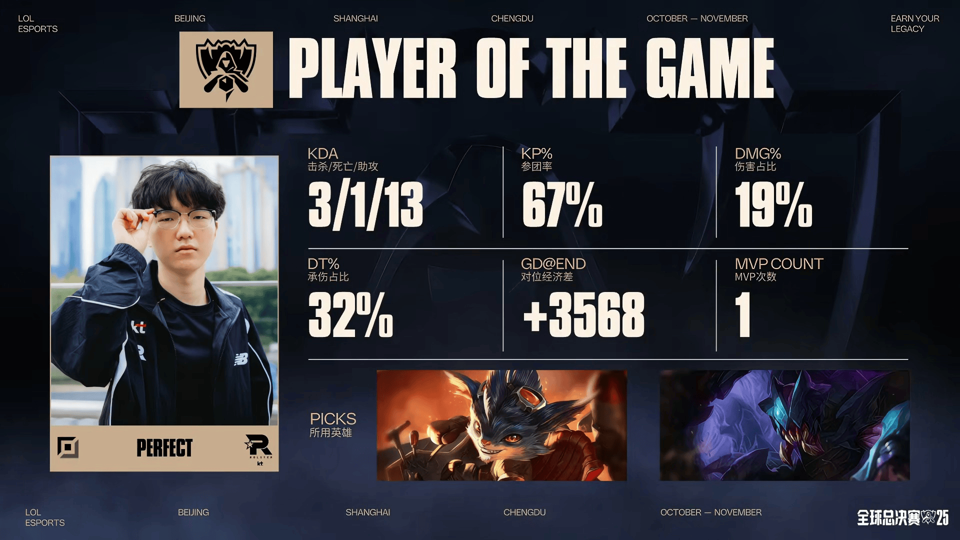 虎扑11月09日讯在刚刚结束的S15决赛的比赛中,PerfecT雷克塞砍下3/1/13的战绩,拿下KT对阵T1次局MVP