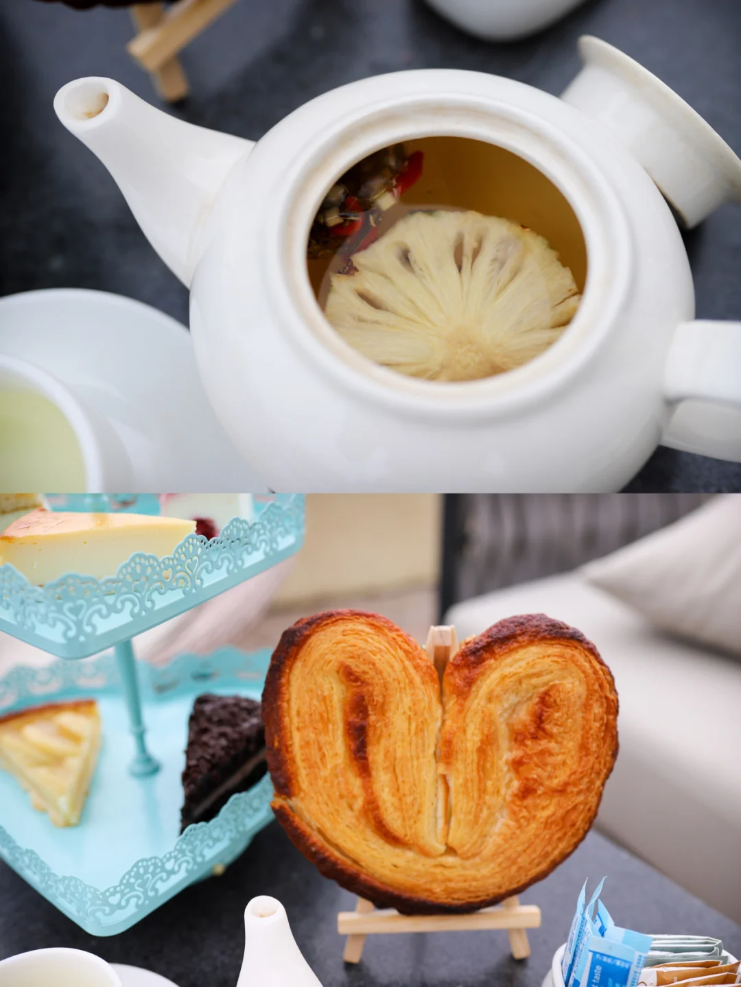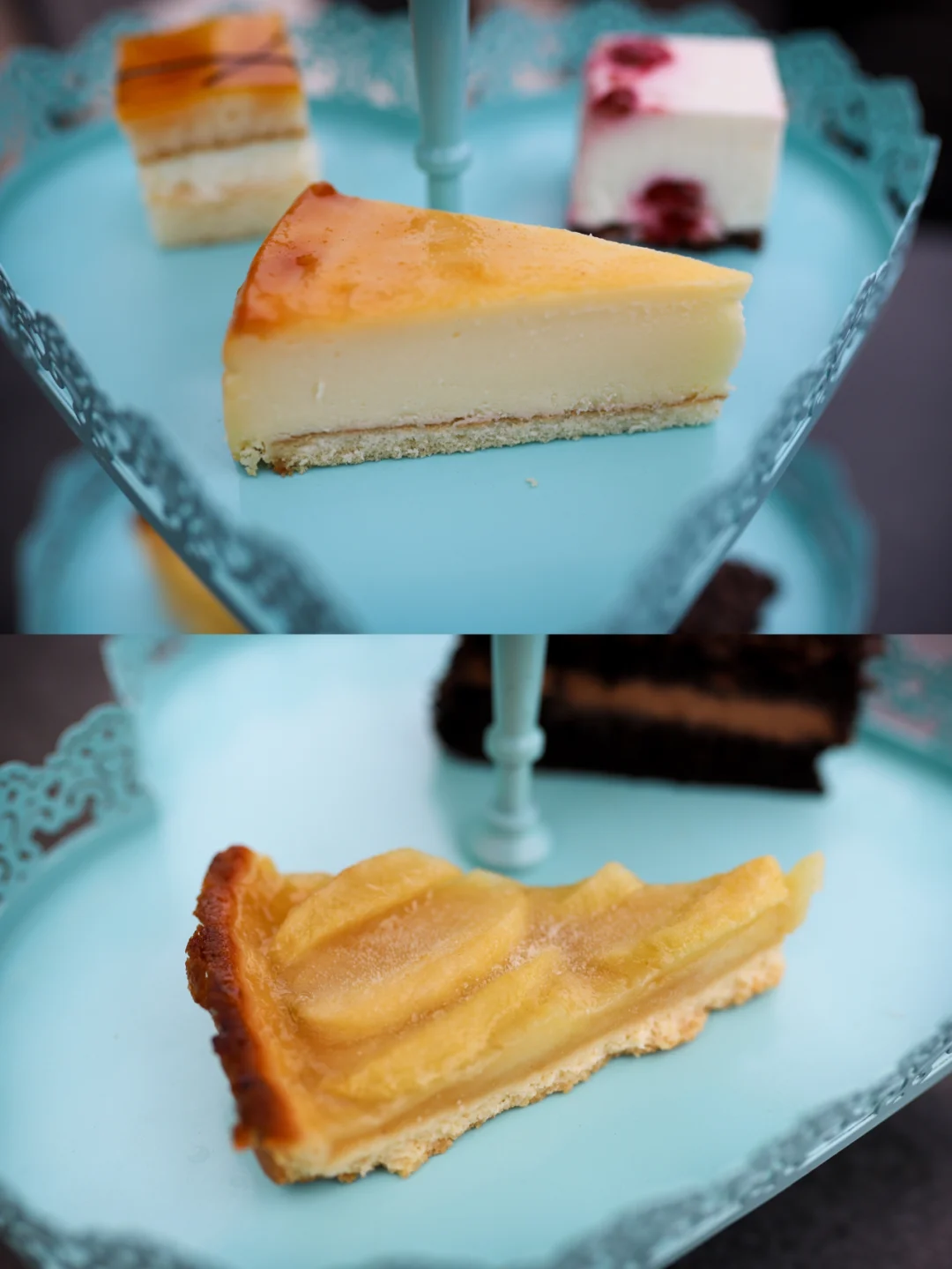 √下午菜的品种很丰富,有欧式苹果达、双压芝士蛋糕、三重巧克力蛋糕、覆盆子酸奶蛋糕、欧洲圣马高奶油蛋糕,特别是那个造形像蝴蝶一样的巨心蝴蝶酥,颜值与口味都非常棒。