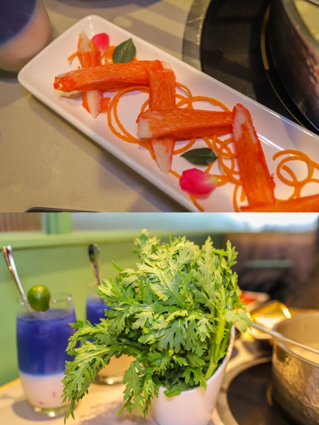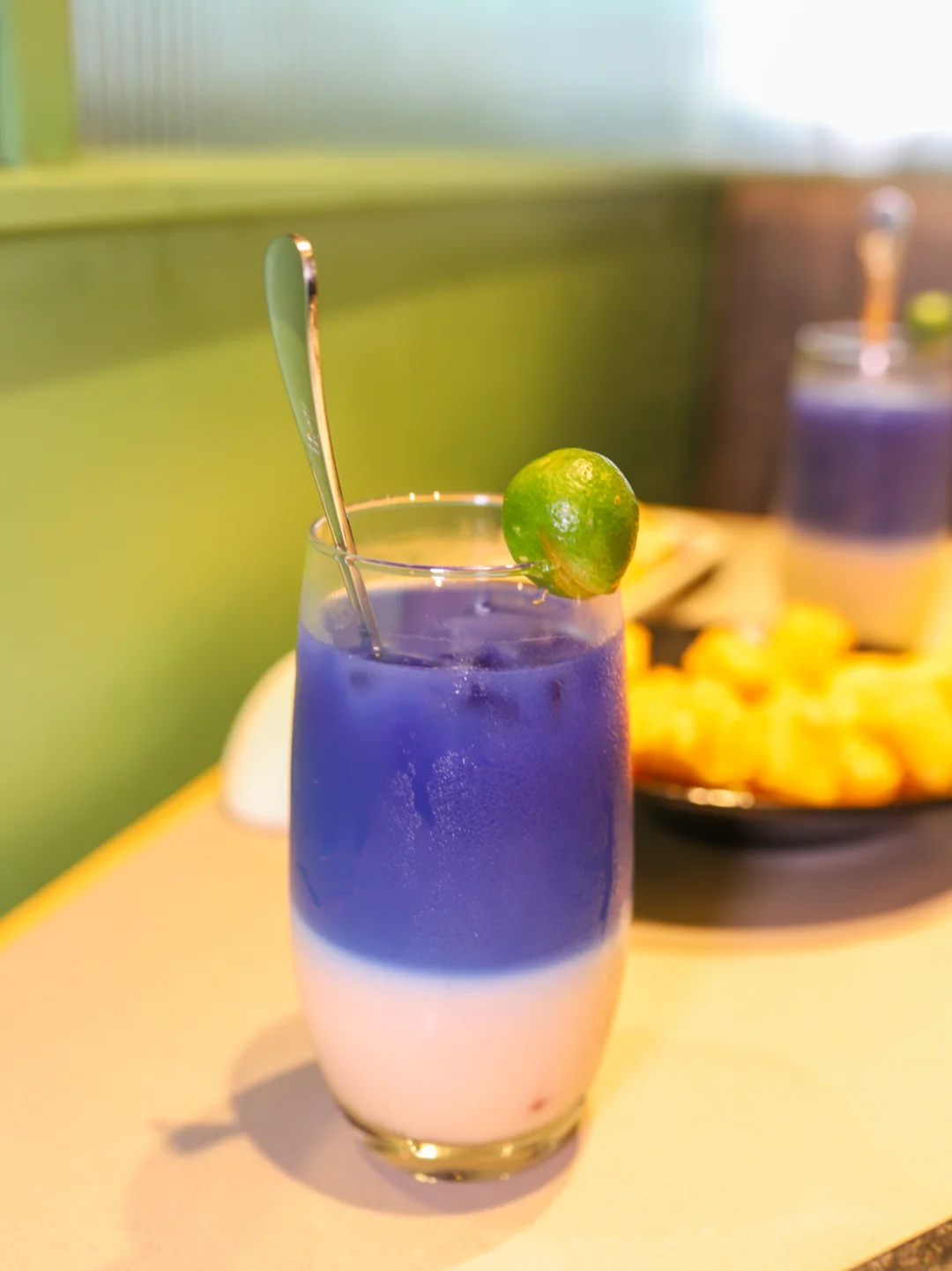 【渐变碟豆花】这是一个高颜值的饮品,原产是泰国,上层是蓝紫色,加入青柠后,搞拌一下,颜色会渐渐发生变化,好看又吃喝。