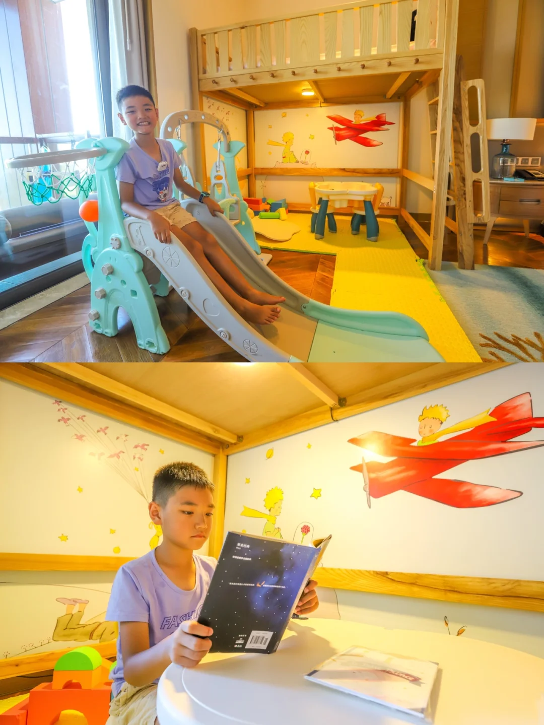 客房内配备了儿童床,还有儿童小天地,里面有滑滑梯,篮球、秋千、积木等,轩轩看到,马上兴奋,激动地打电话给他的朋友分享喜悦。