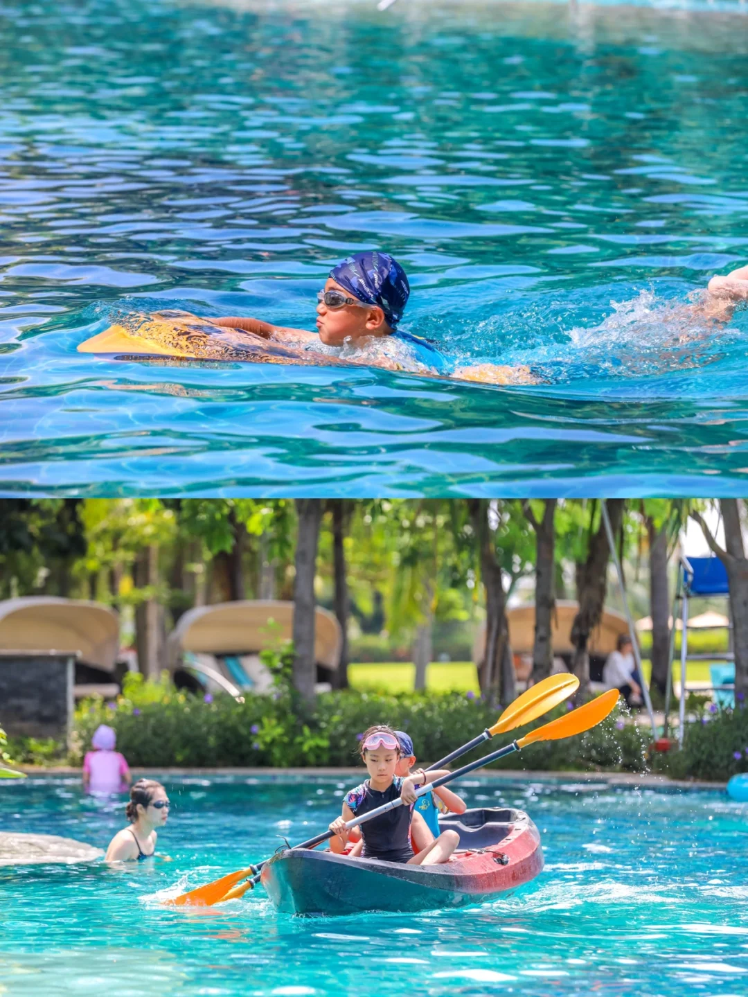 推荐主泳池里面的皮划艇,两个人一起划,好玩又容易出片。