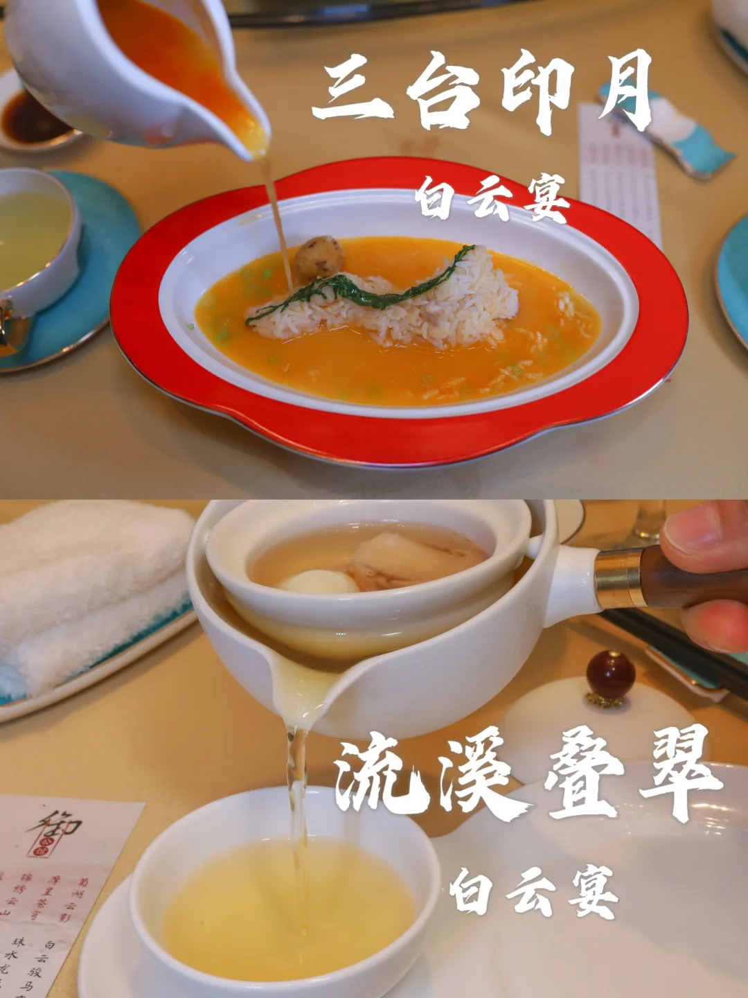 最后一道菜是三台印月,它以顺德鱼茸和龙虾拆汤为主要食材,搅拌后与镬煮饭一同品尝,粗粮的纤维帮助消化,口感层次丰富。