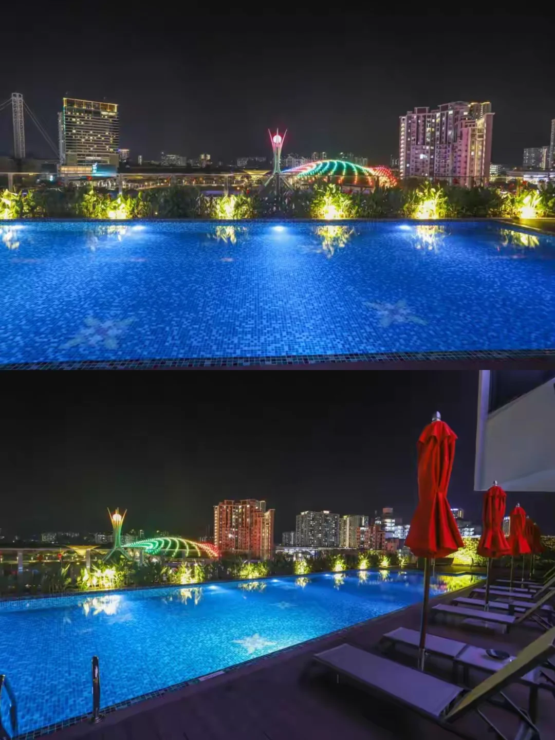 游泳池夜景非常好看,可以看到SPICE的景观,五彩灯饰非常耀眼。