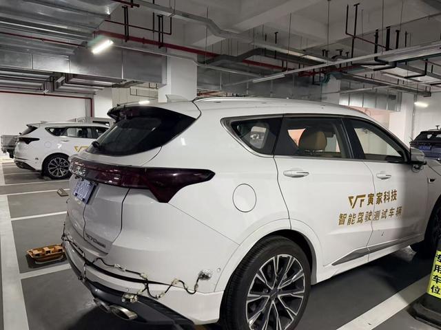 在地下车库,并不难找到徐女士口中的“测试车辆”。这是两辆白色的奇瑞捷途车型,右侧车门上,标有“寅家科技智能驾驶测试车辆”的字样。记者注意到,测试车辆周身缠满了外接线缆,从车头位置向后缠绕,一直延伸至车尾,直接用胶带固定。在这些线缆之下,车身上到处可见坑坑洼洼的磕碰痕迹。在这两辆车的对面,还另有一辆蓝色捷途,除车身的外接线缆外,还安装有定位设备及各类传感器。