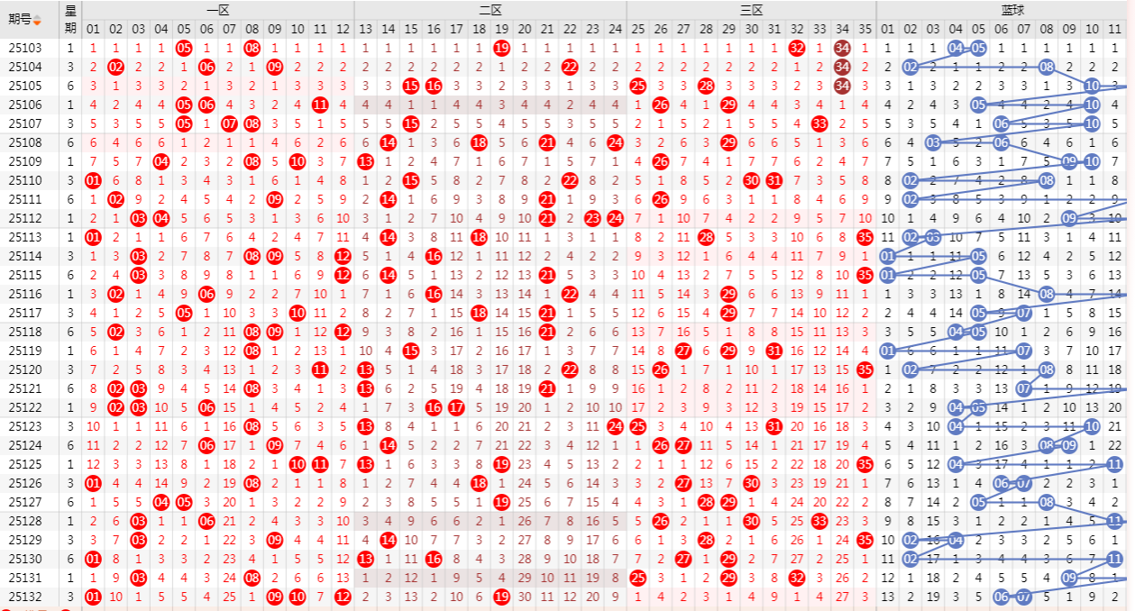 区间分布:三区比重点关注1:2:2或2:2:1,30-35区间号码有望回补,可留意冷号31、34;