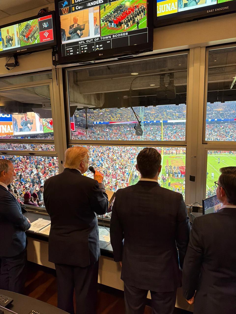 特朗普从佛罗里达出发,前往华盛顿特区观看橄榄球比赛。 8:特朗普在离开华盛顿指挥官队比赛现场时,把自己的总统挑战币递给了一名小男孩。 9:华盛顿指挥官队老板乔什·哈里斯赠送给特朗普一件印有“47”号的球衣。