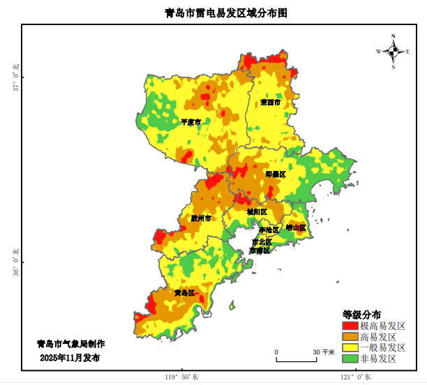 青岛市雷电极高易发区、高易发区、一般易发区、非易发区均有分布,分别占5.16%、27.31%、49.57%、17.95%。极高易发区主要位于平度市北部和西南部的局部、莱西市北部、即墨区西部和南部的局部、胶州市北部和西部、城阳区西北部、崂山区东部、黄岛区西南部和东部局部;高易发区主要位于平度市北部和南部的局部、莱西市北部、即墨区西部、胶州市大部、城阳区北部和东部、崂山区中部、黄岛区中南部;一般易发区主要位于平度市中东部、莱西市大部、即墨区中部、胶州市东南部、城阳区南部、李沧区大部、市北区大部、崂山区中西部、黄岛区中北部大部;其他区域为非易发区。