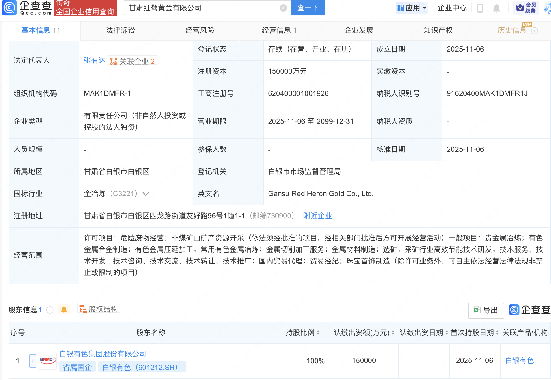 企查查APP显示,近日,甘肃红鹭黄金有限公司成立,注册资本15亿元,经营范围包含:常用有色金属冶炼;金属切削加工服务;金属材料制造;选矿;采矿行业高效节能技术研发等。企查查股权穿透显示,该公司由白银有色(601212)全资持股。