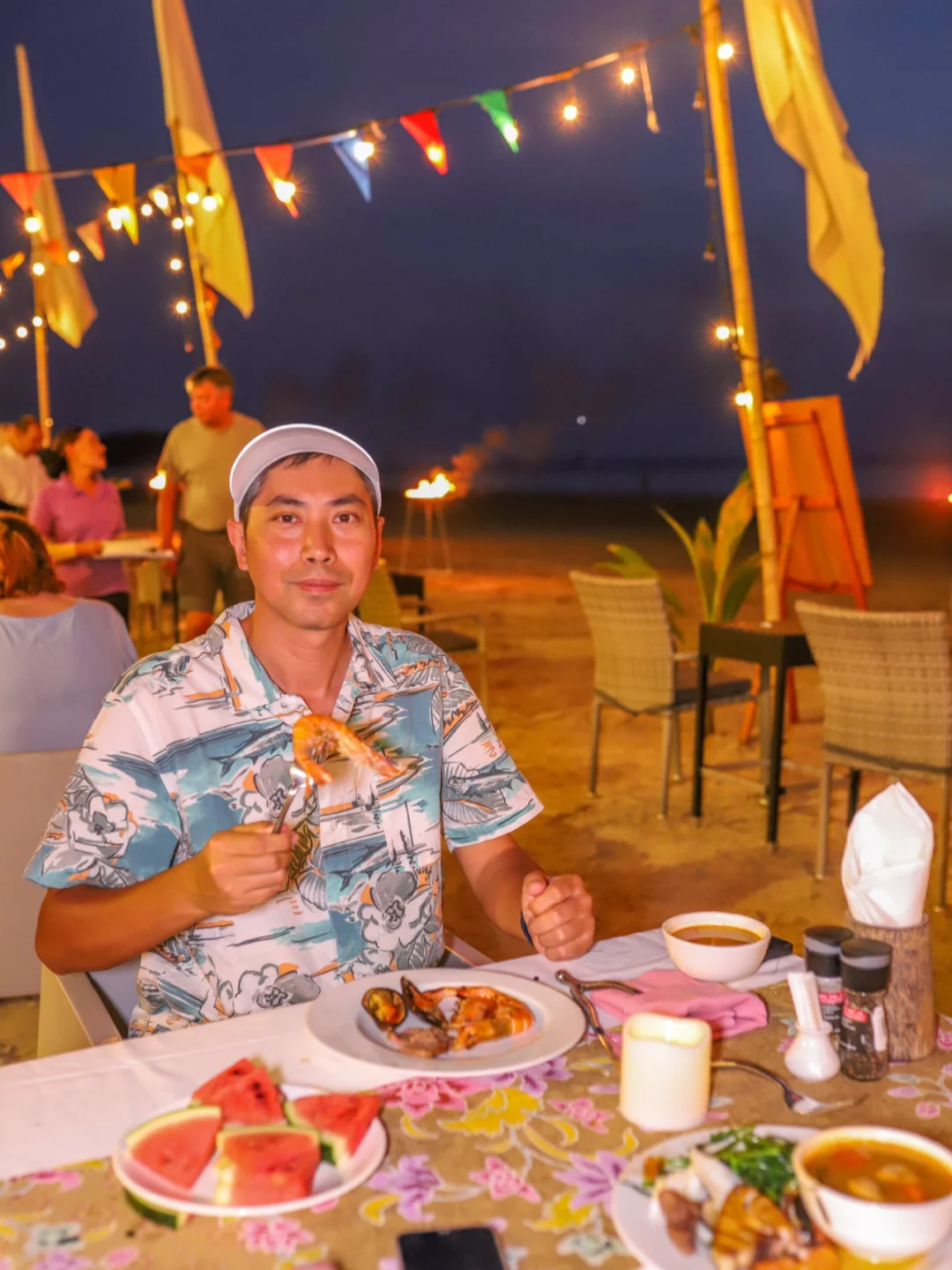 我到的时候,正好是周六,晚上的自助餐,设在沙滩上用餐,脚踩着沙子品尝美食,非常有情趣。