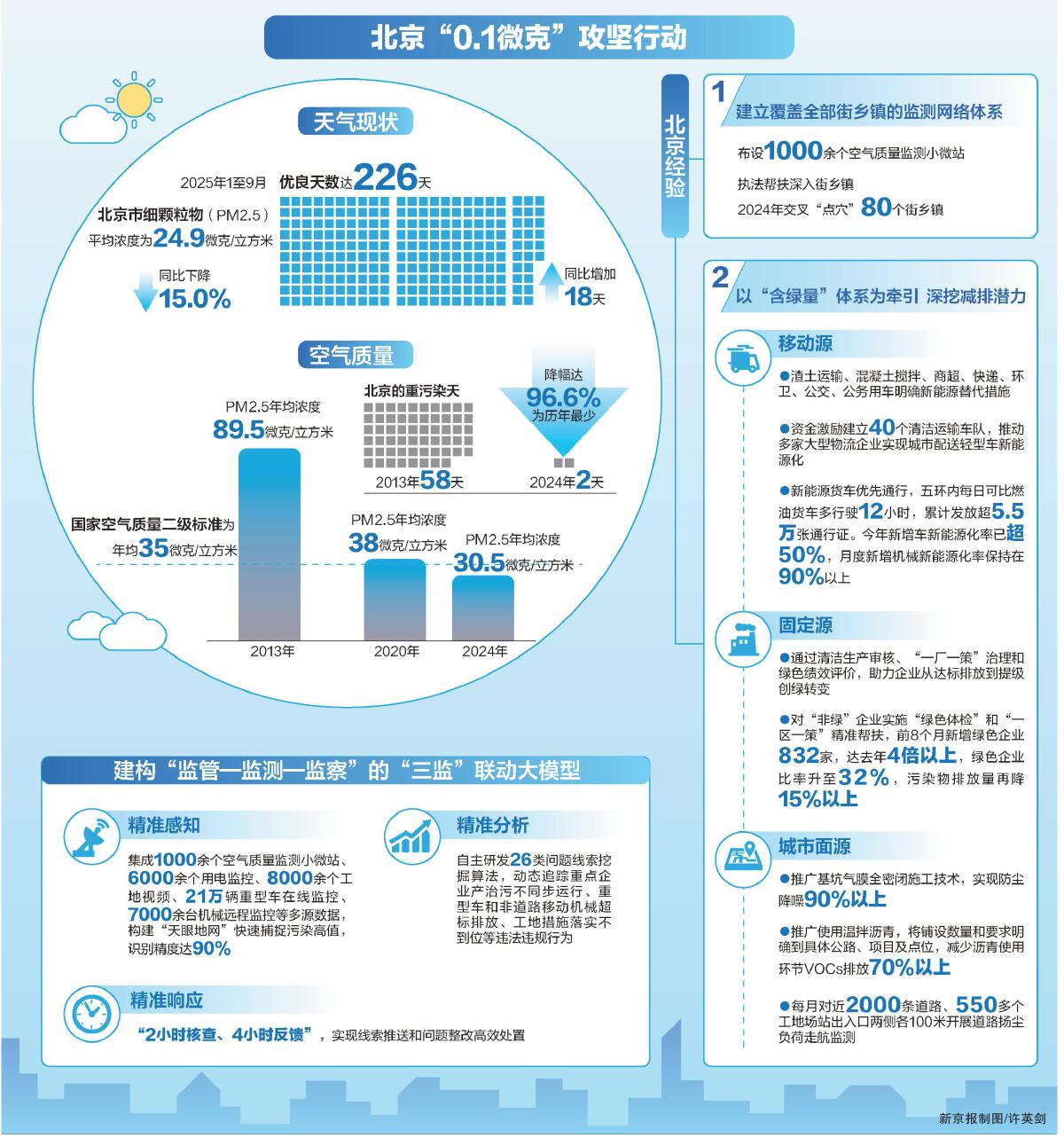 这其中有何“北京经验”?“十五五”将如何取得进一步突破?就此,记者采访了北京市生态环境局大气环境处处长谢金开。据其介绍,近年来,北京市聚焦PM2.5治理,将“一微克”行动提级实施“0.1微克”攻坚行动,构建“单元治理—源头创绿—数智赋能”的精细化治理体系,0.1微克、0.1微克地精抓细抠,探索以精细化治理推动空气质量持续改善的有效路径。