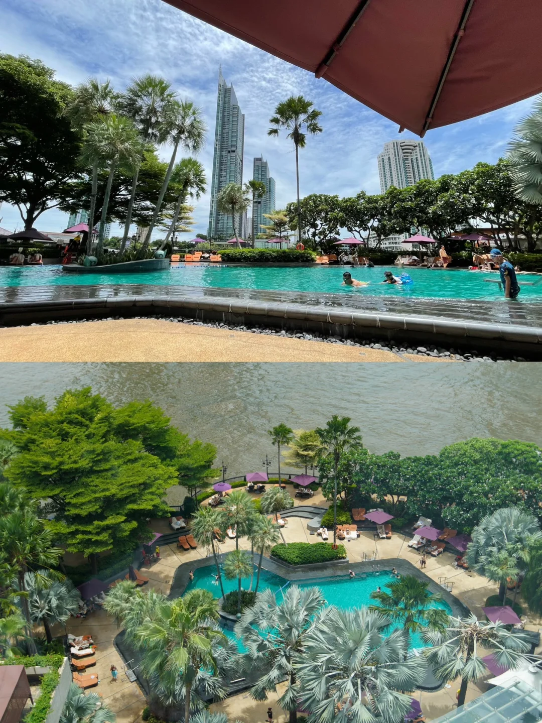 香格里拉有两个泳池,分别是香格里拉翼的中心泳池和曼谷翼的泳池,中心泳池景观最棒,旁边就是湄南河景,泳池旁边的绿植相映,让游泳的人有种身处都市桃源的感觉。