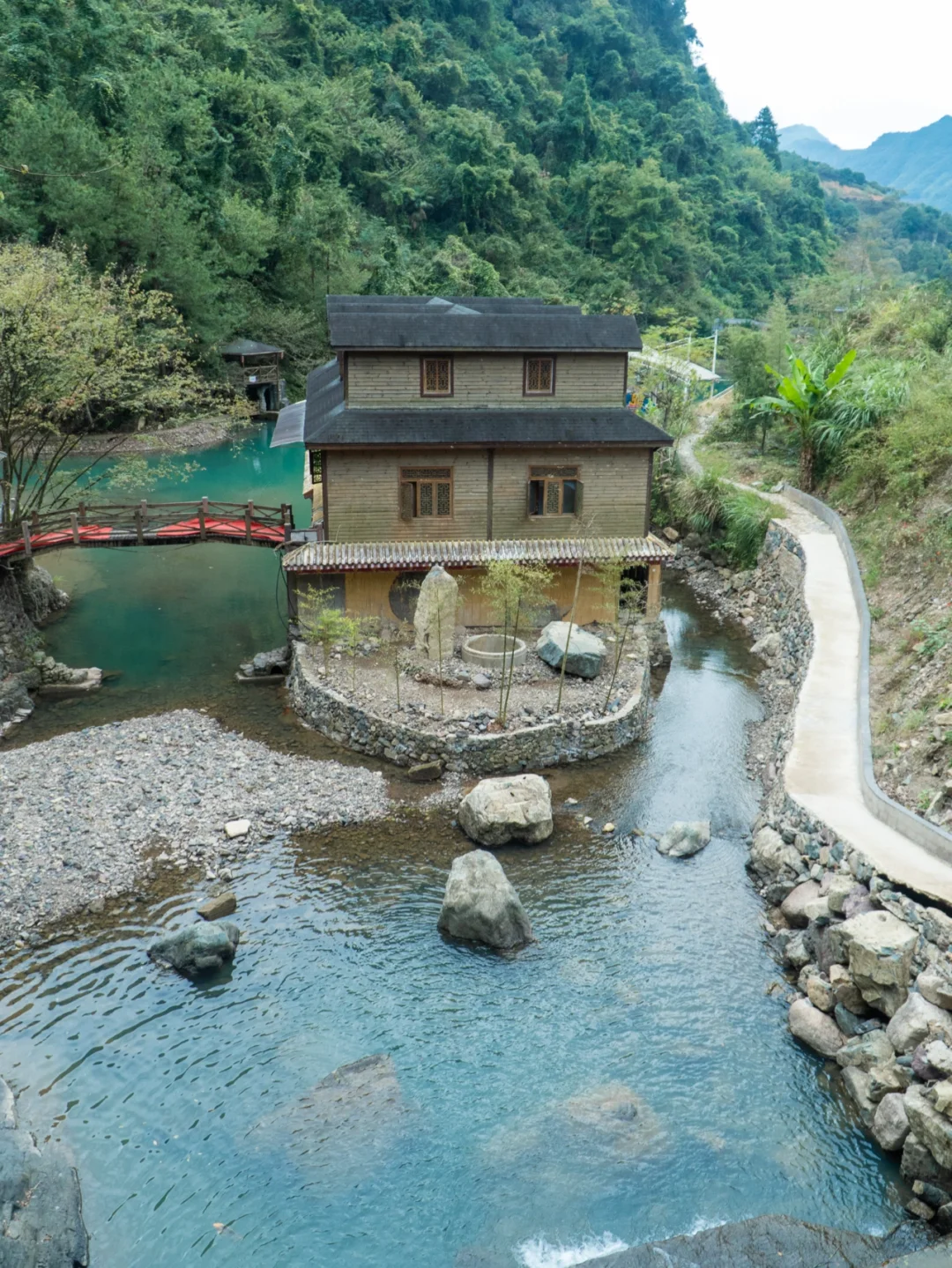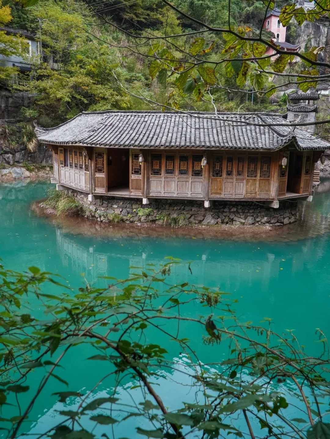 这里有垂直而下的龙门飞瀑,有震撼的湖中小屋,还有大龙舟,湖水颜色翠绿,颜值颇高。