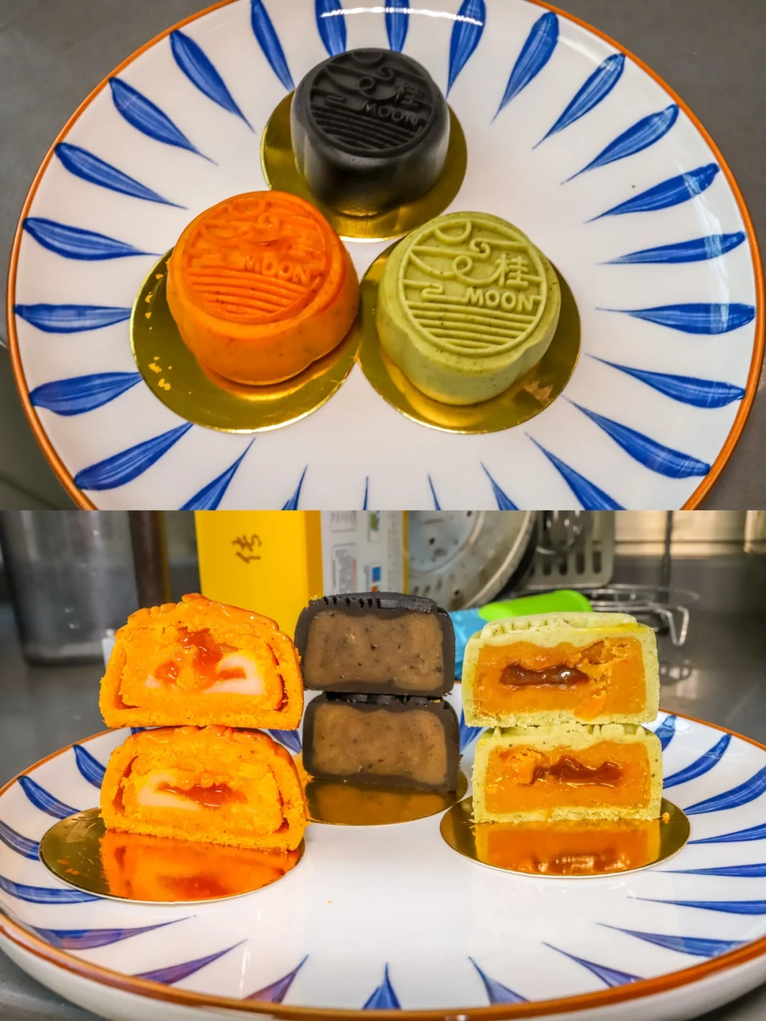 黄色的是传统口味,就是淡淡的桂花香味,里面是流心奶黄,入口即化,余味会有桂花茶香。