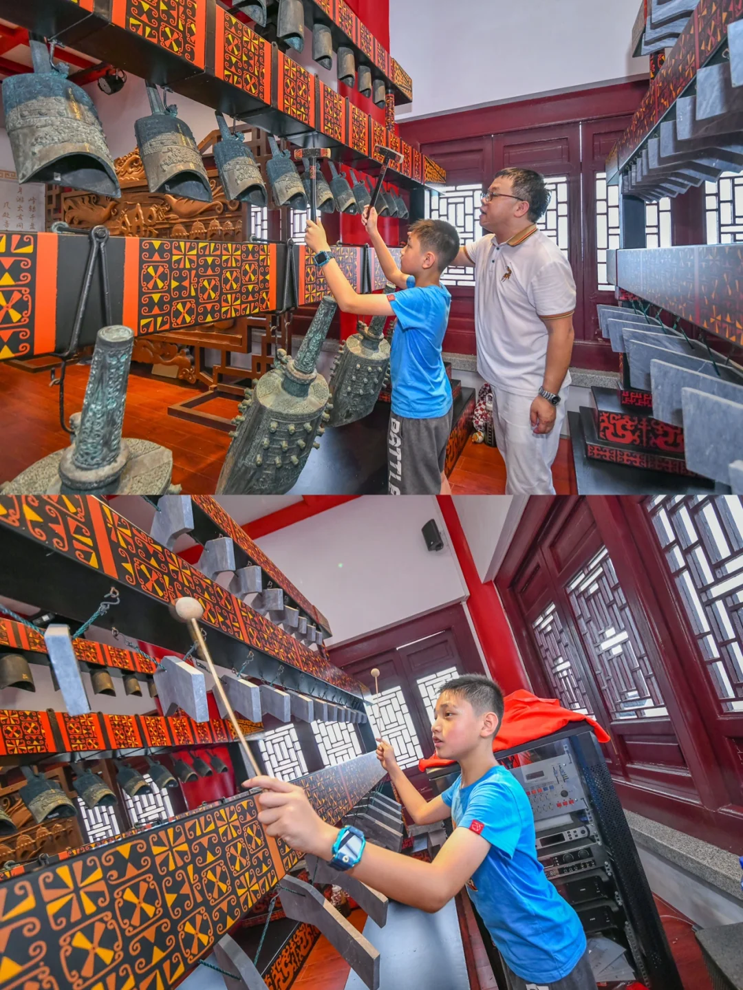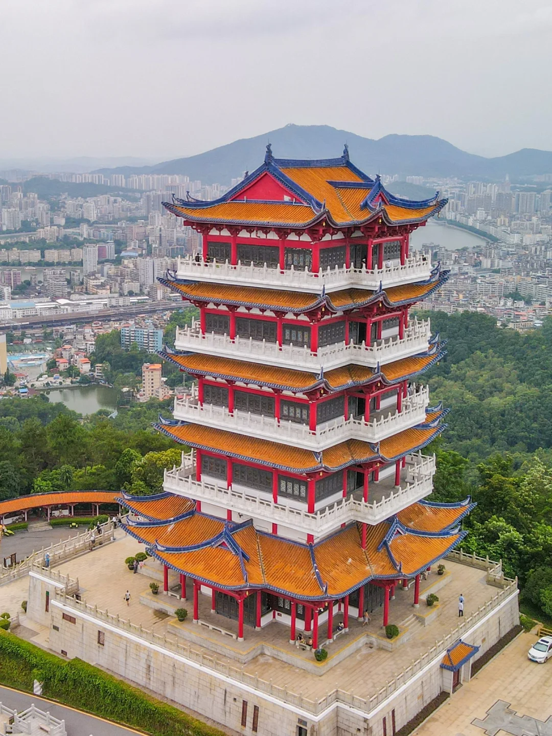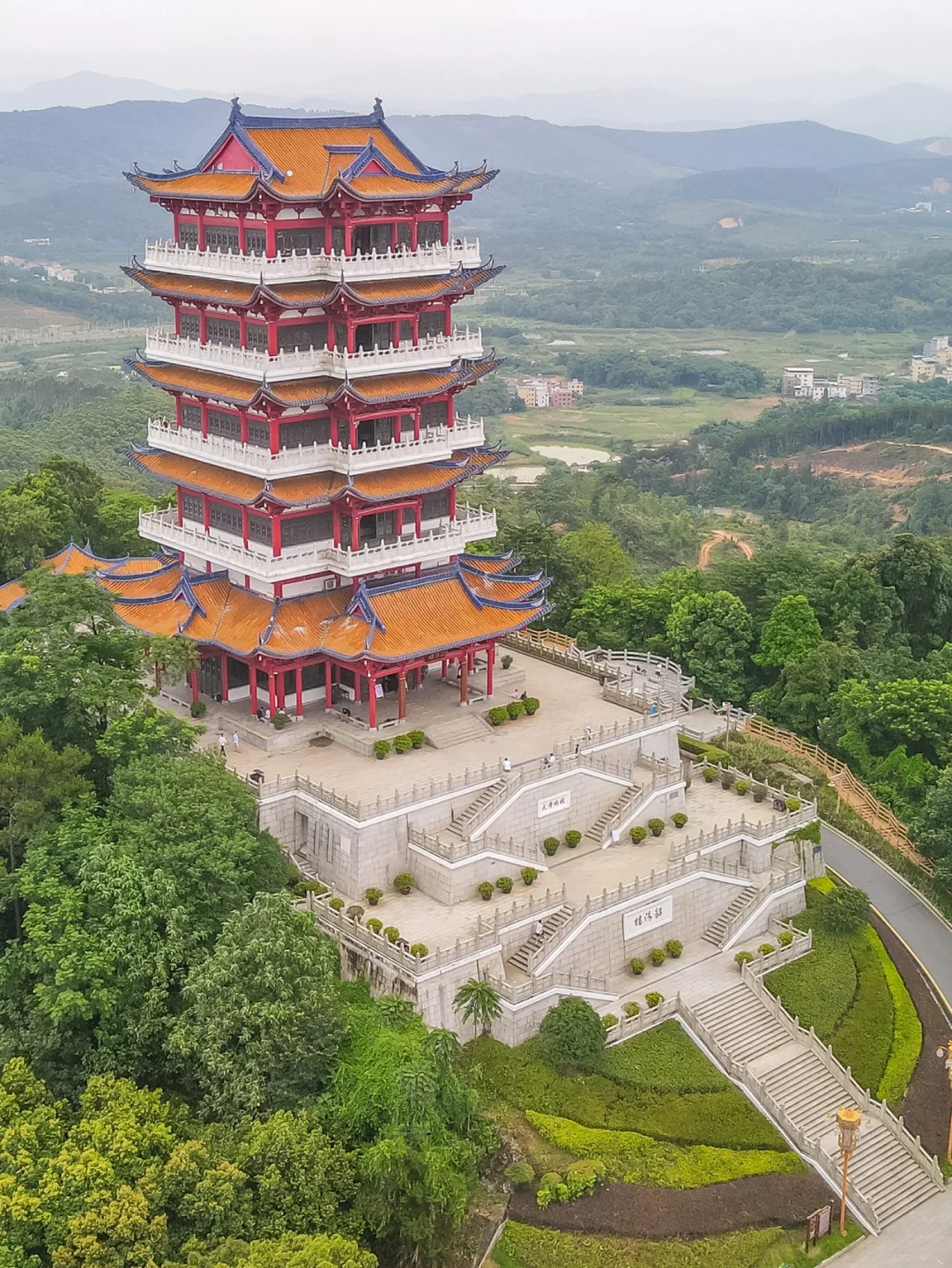 韶关亲子游第一站,韶关国家森林公园,乘游览车到达莲花峰山顶的韶阳楼,这是一栋五层高的中国传统建筑风格楼阁,航拍非常的宏伟壮观。 - 在韶阳楼一层,保留了以前六角古塔基遗址,每一层楼都有不一样的展览,登楼时可以了解韶关历史。 - 第五层有敲编钟、弹古筝一些寓教于乐的亲子体验。 - 因为地势高,在塔上俯瞰韶关的三江六岸,风景蛮不错的。