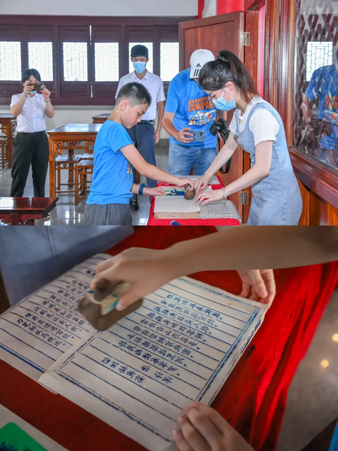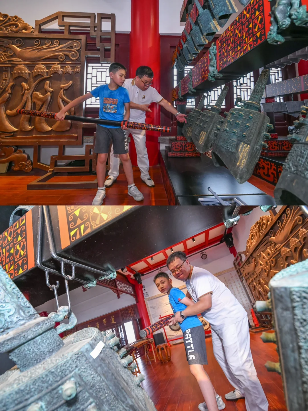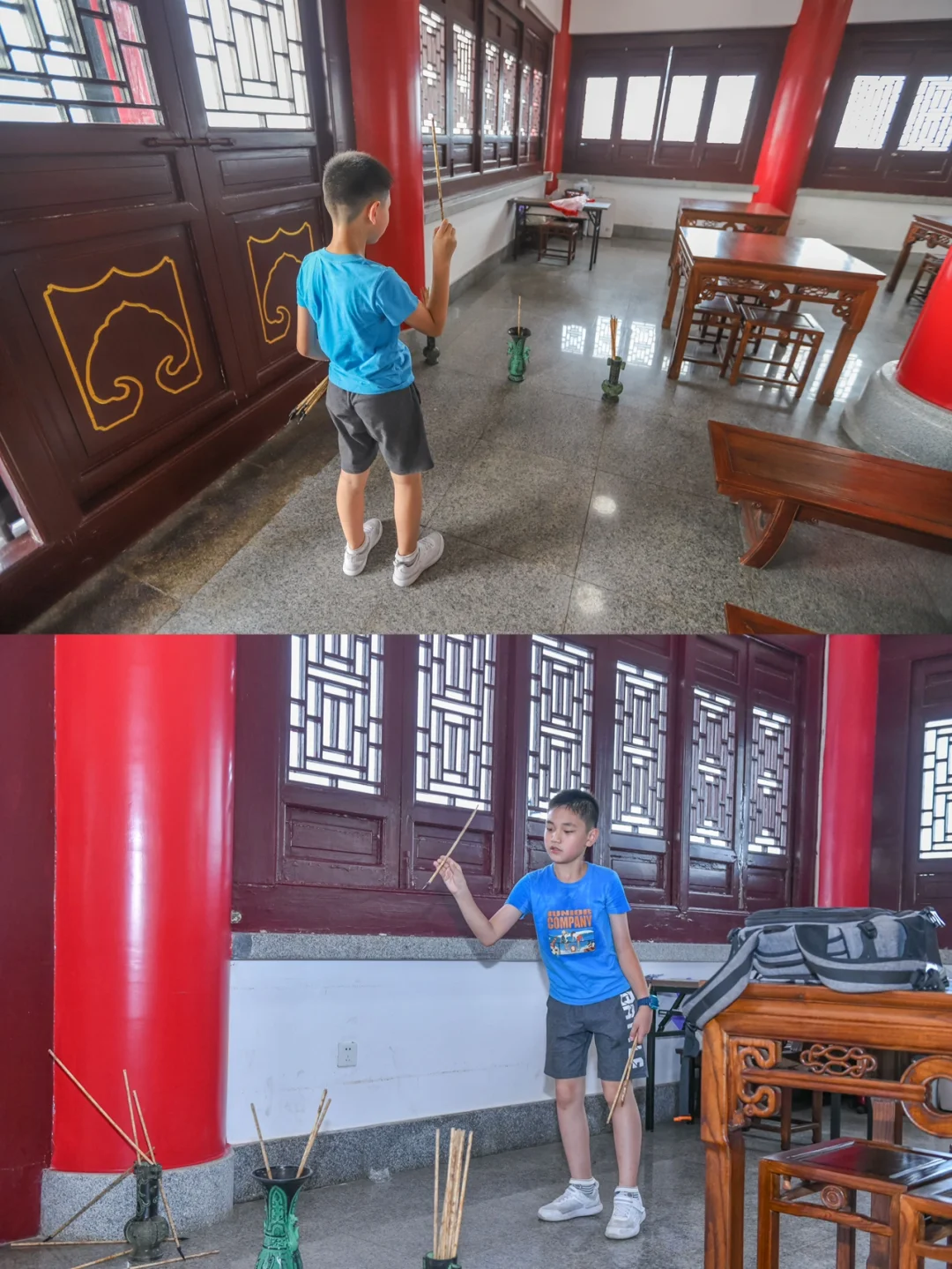 韶关亲子游第一站,韶关国家森林公园,乘游览车到达莲花峰山顶的韶阳楼,这是一栋五层高的中国传统建筑风格楼阁,航拍非常的宏伟壮观。 - 在韶阳楼一层,保留了以前六角古塔基遗址,每一层楼都有不一样的展览,登楼时可以了解韶关历史。 - 第五层有敲编钟、弹古筝一些寓教于乐的亲子体验。 - 因为地势高,在塔上俯瞰韶关的三江六岸,风景蛮不错的。