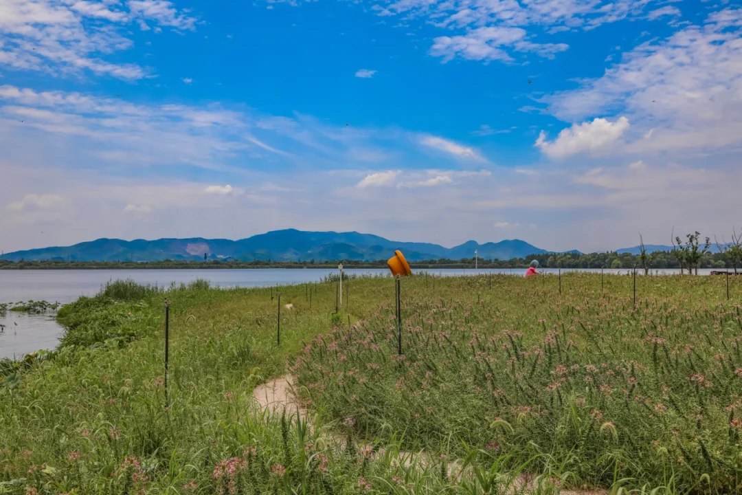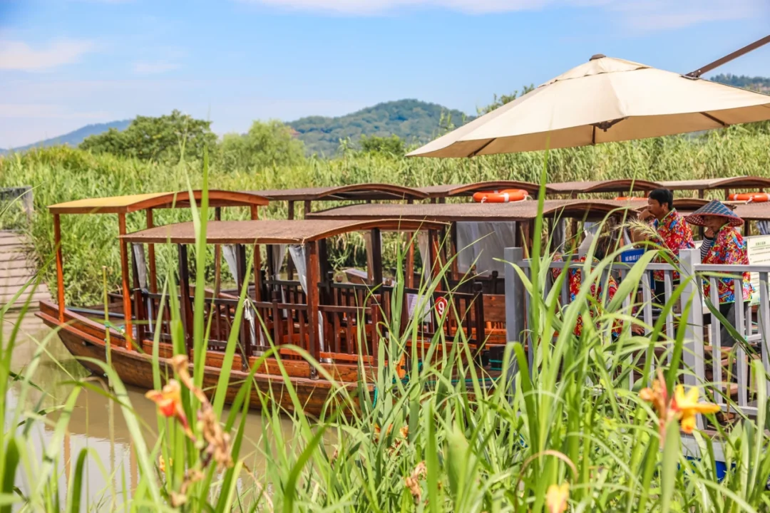 船行至湖中央,湿地之上港汊交错,芦苇成片,湖水清澈,时不时会有野鸟飞到芦苇荡上休息,湖面上遍布了水生动植物,至今仍保持了自然质朴、原始野逸的江南水乡风貌。