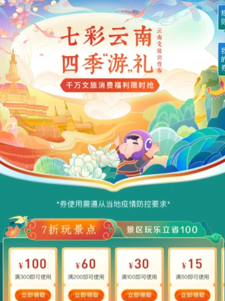 4,要去的同学们注意啦,同程旅行APP可以领云南文旅消费券,zui高可领2022哦!!Sou关键词“云南”“云南文旅消费券”“云南文旅加油券”等进入页面,领取一张云南文旅消费券后,即可同步领取打车券,zui高直减20元!