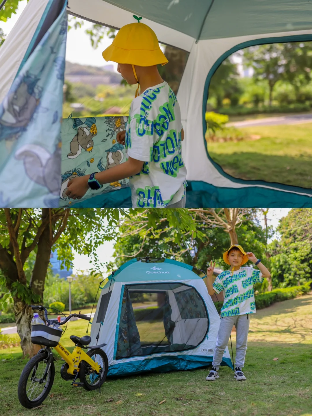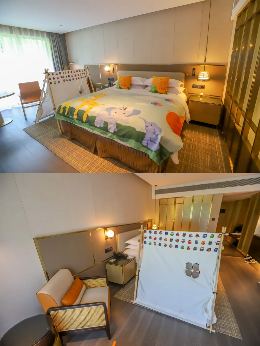 我们这次住的是精英房,做了亲子布置,房间里配备了一顶很别致的小帐蓬,床旗也是很可爱的长颈鹿图案,儿子看到就兴奋不已。