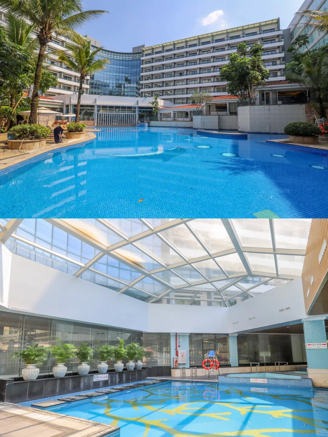 酒店的娱乐设施主要有三个户外游泳池,室内池为35米长。室内池为15米恒温,另外花园里还有一个泳池,不过暂时没开放。