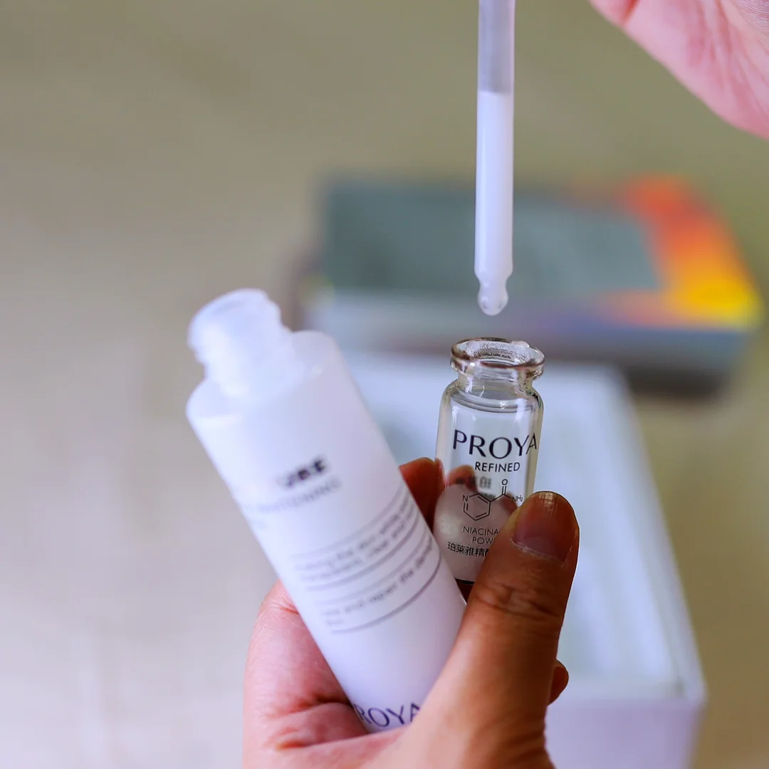 我用的是珀莱雅的烟酰胺雪肌精华套装,这个牌子的烟酰胺精华有个挺有意思的地方就是液-粉分离,为了稳定99%高纯度烟酰胺粉的活性,烟酰胺粉是医用注射剂瓶保存,和精华是分开的,准备用的时候再和精华液融合,使用前才调配,保证有效成分得到充分利用前不流失,开瓶的时候像科学工作者一样拿着滴管往试管里加入混合好的精华液,特别有参与感,做好之后就可以加入我的护肤品大家庭了!