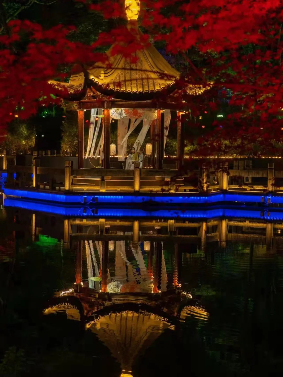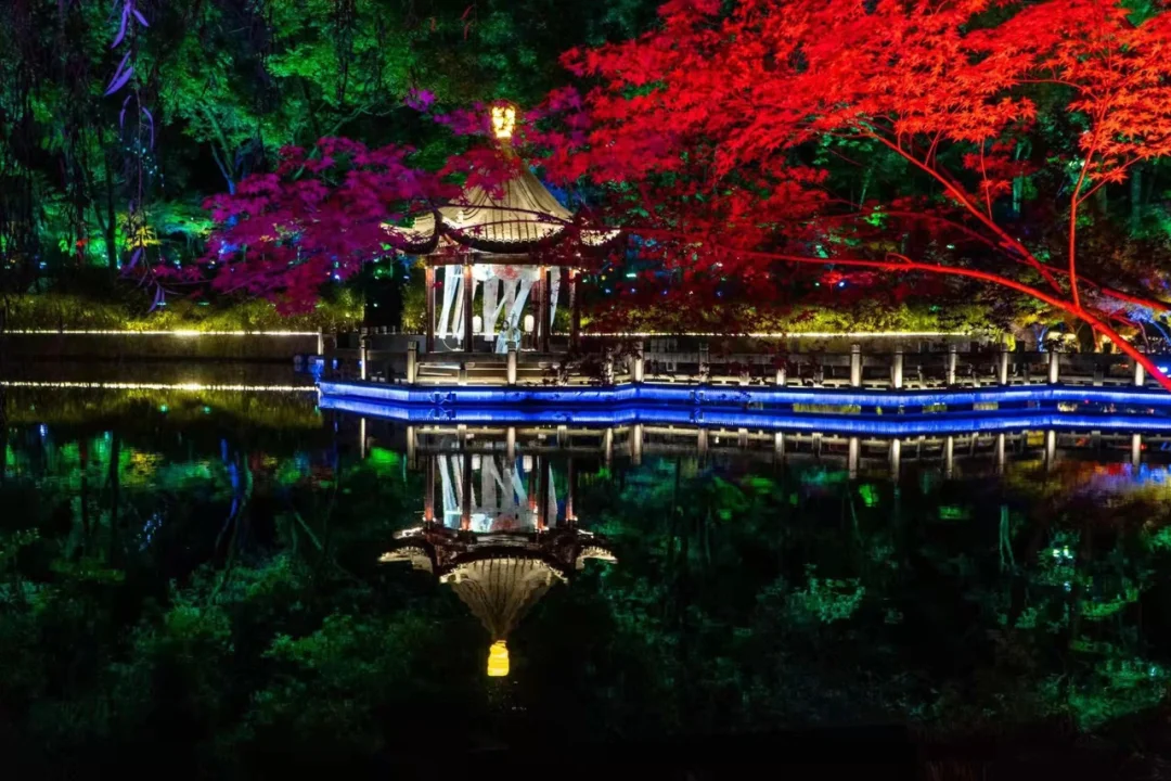 湖景夜枫:晚上明镜湖亭里有琵琶演奏,伴着悠扬雅致的古典乐声,赏湖边夜枫,七彩灯光斑斓璀璨,美好的夜晚令人回味。