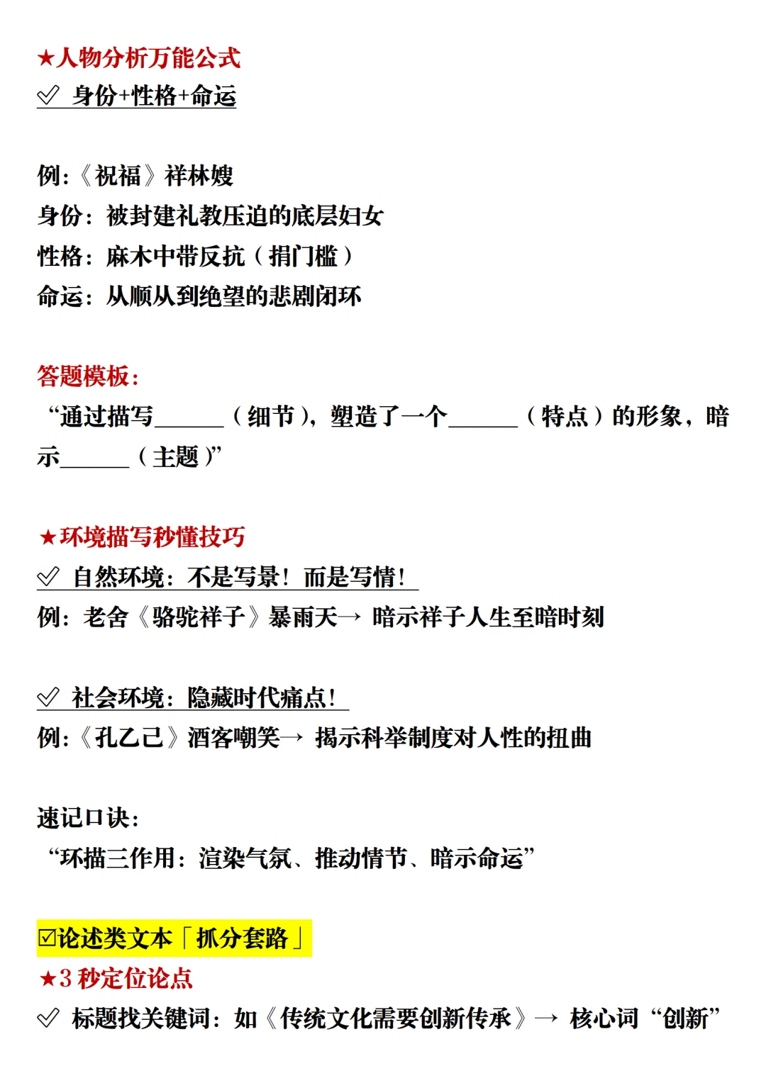 例:《孔乙己》酒客嘲笑→ 揭示科举制度对人性的扭曲