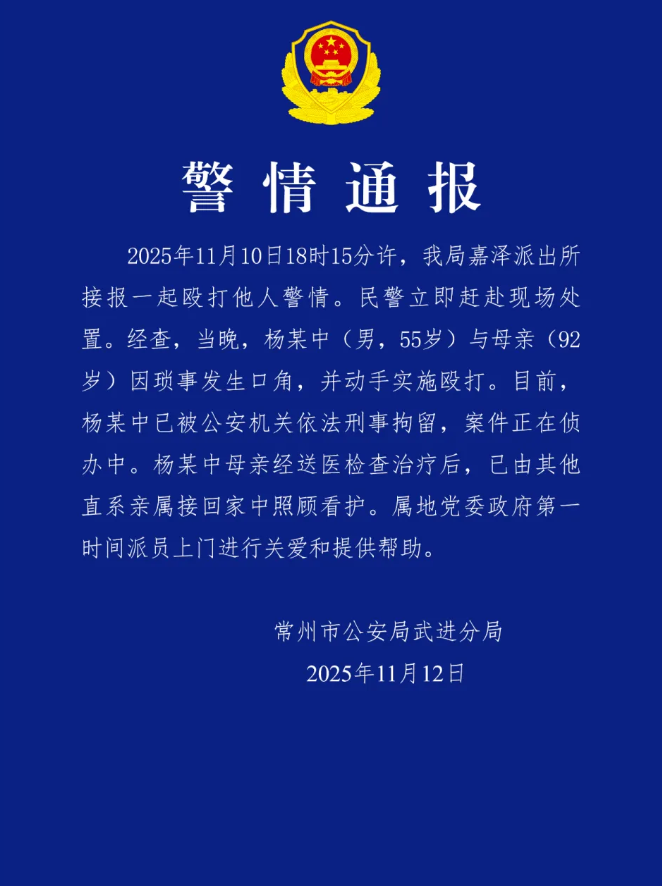 2025年11月10日18时15分许,我局嘉泽派出所接报一起殴打他人警情。民警立即赶赴现场处置。经查,当晚,杨某中(男,55岁)与母亲(92岁)因琐事发生口角,并动手实施殴打。目前,杨某中已被公安机关依法刑事拘留,案件正在侦办中。杨某中母亲经送医检查治疗后,已由其他直系亲属接回家中照顾看护。属地党委政府第一时间派员上门进行关爱和提供帮助。
