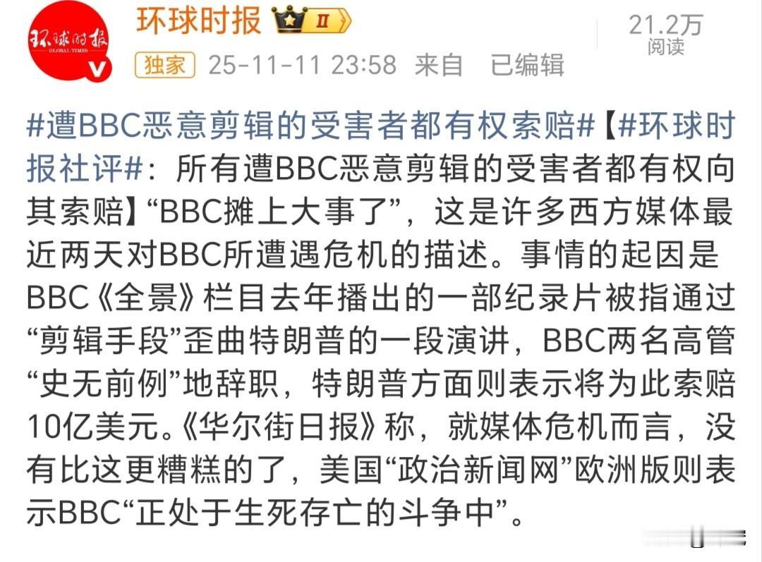 BBC瞎BB川普,川普要索赔10亿美元,环球发了一篇文章说,任何被BBC瞎BB的受害人都有权提起索赔。这个BBC报道英国以外的新闻好像不受什么英国媒体伦理什么机构的约束,就是说它可以敞开了对非英国的事造谣。创作训练营开营啦特朗普起诉BBC索赔10亿美元 BBC两名高管因特朗普纪录片争议宣布辞职