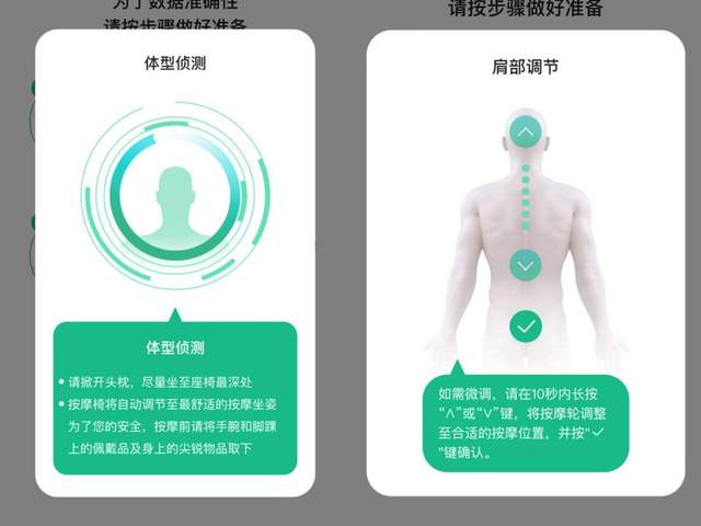 在酸痛监测的同时,3重体型调节系统还会根据体型差异自动侦测肩颈、腰背等、腿长,精准到穴位,感觉就像量身定制西装一样,服务可以说很到位了。