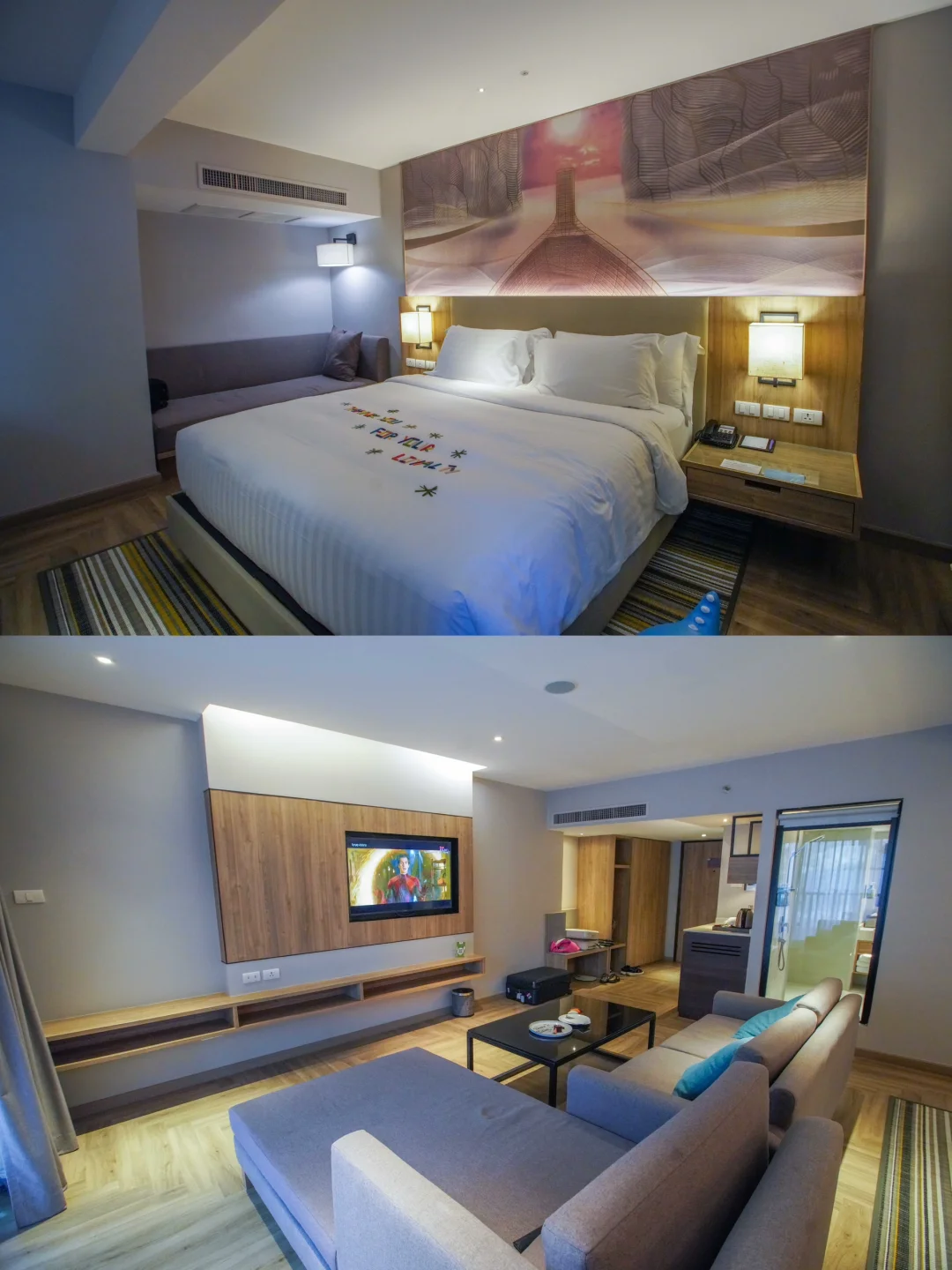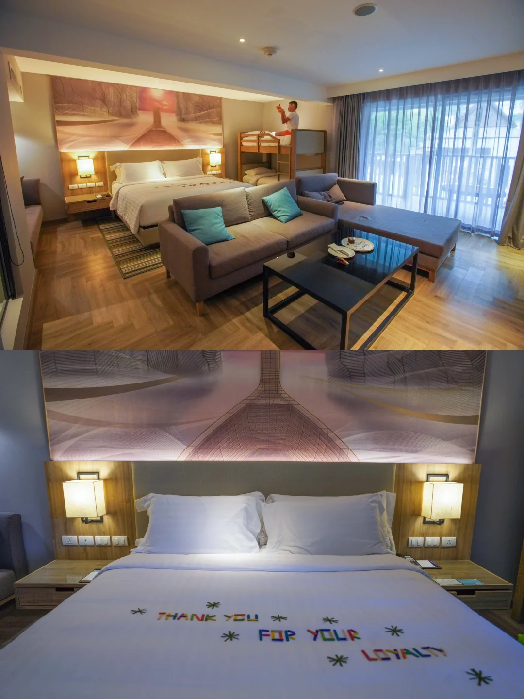 套房分为公区和睡眠区,开放式设计,时尚简约的装修风格,一家四口入住也是觉得非常宽的。