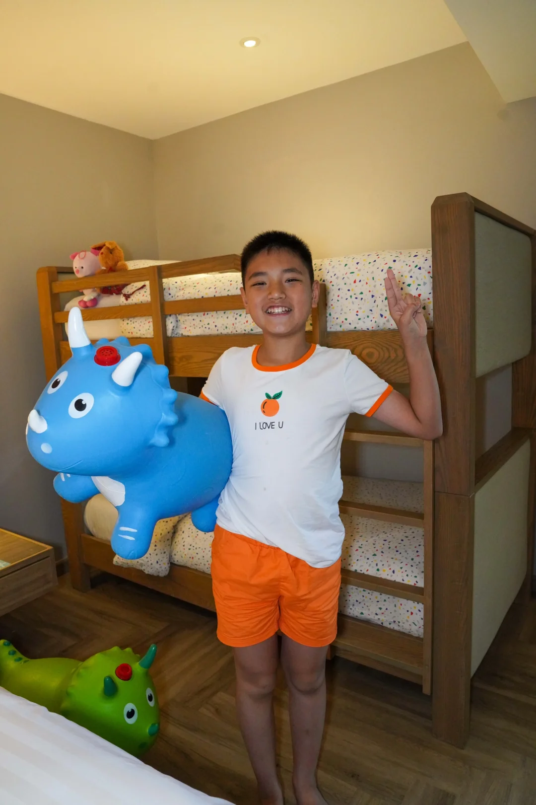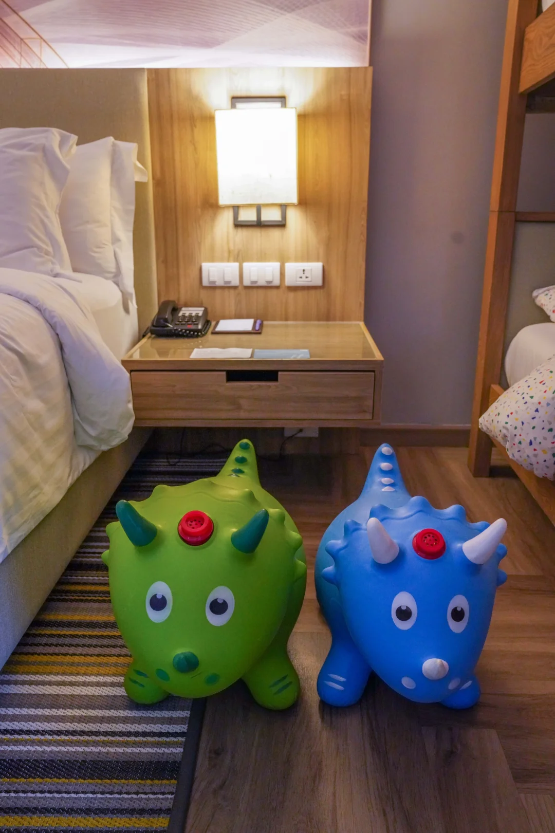家庭套房一张超大的床和儿童专用床,分为上下铺,被子的颜色非常鲜艳,上面各摆放了公仔和玩偶,非常有童趣感。