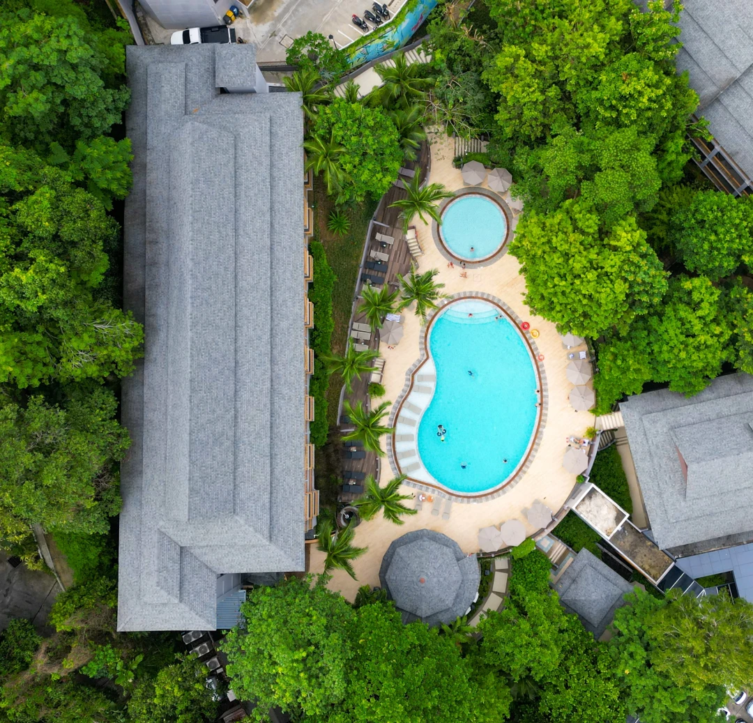 酒店有两个户外泳池,其中圆形为儿童池,亲子可以和孩子一起玩水球,球他们可以提供,旁边的吧台有免费的干毛巾提供。