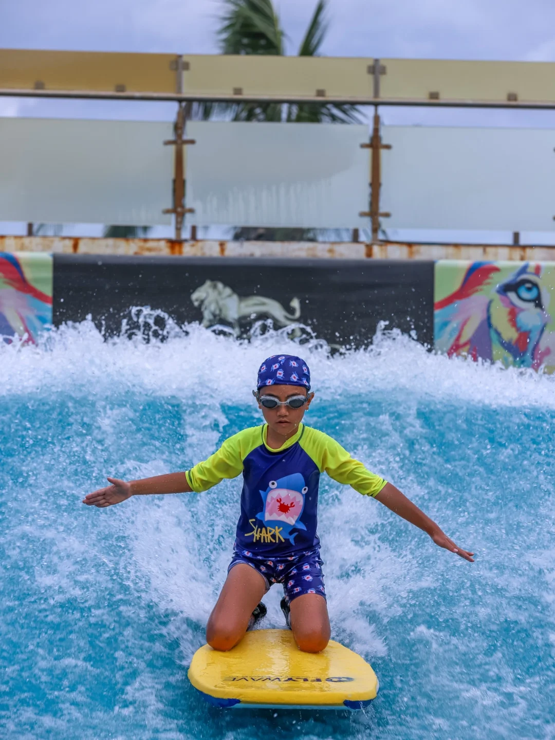 体验过程先要换上冲浪专用的鞋子,由专业冲浪教练一对一现场指导,通过冲浪模拟器的运转,实现在陆地上冲浪的超炫玩法。
