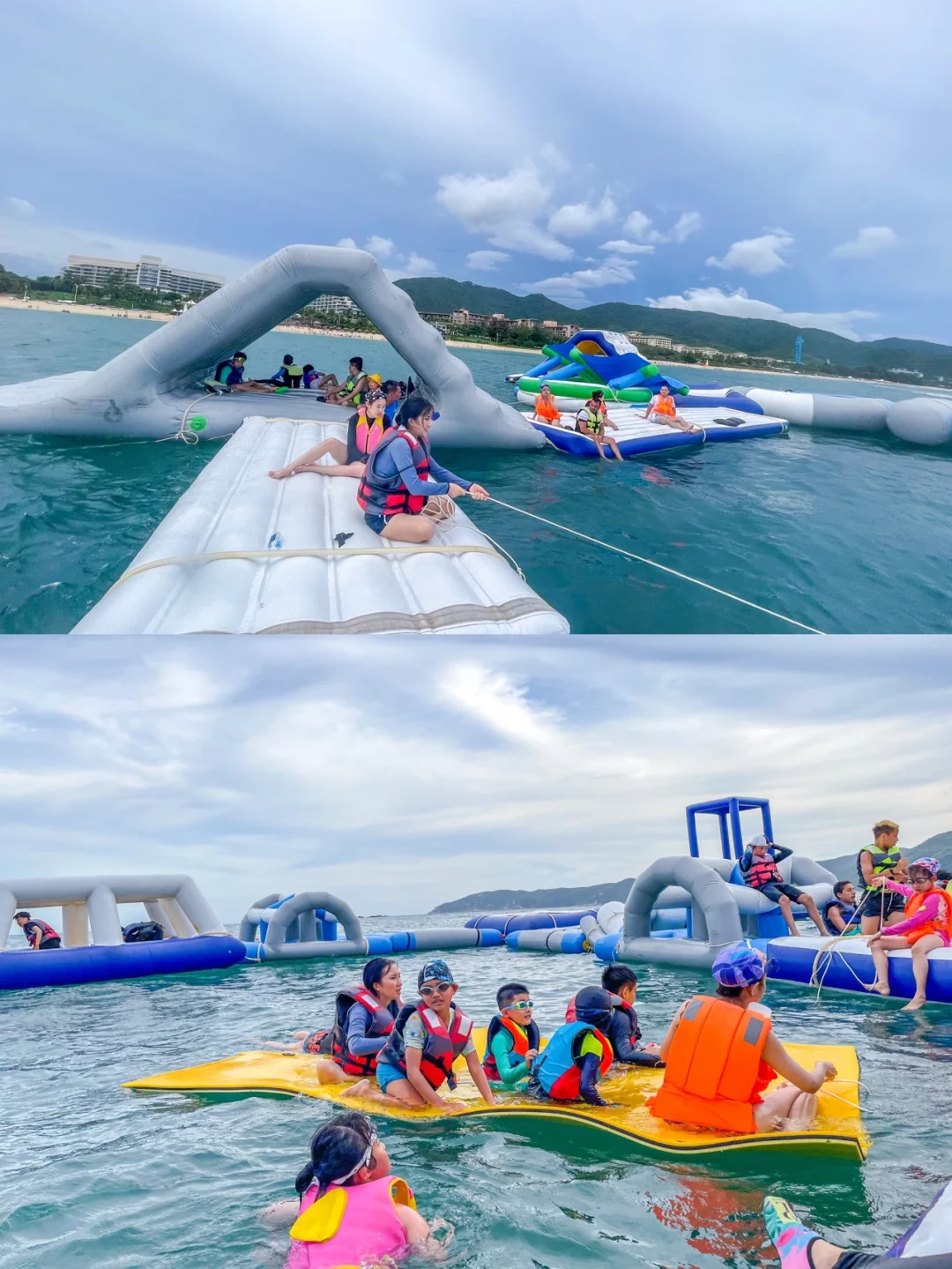 首推海上城堡,整个城堡均由充气床蹦床组成,包括滑梯、跨栏、滚筒、太空漫步等多个项目组成,它悬浮于亚龙湾正中心的海面上。