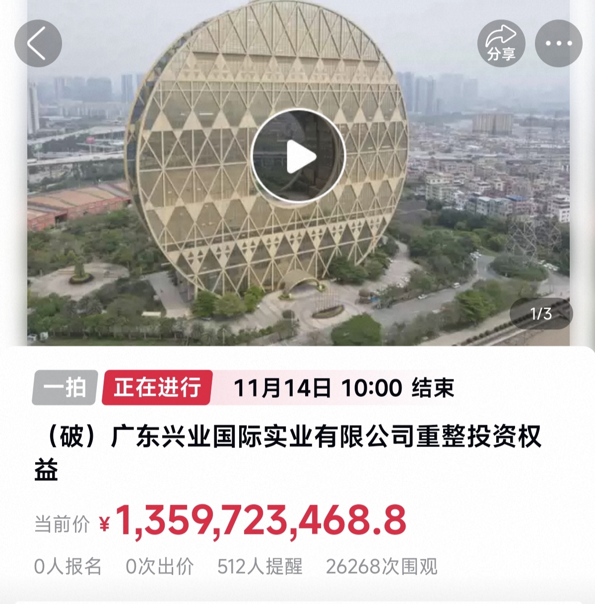 拍卖平台显示,拍品名称是广东兴业国际实业有限公司重整投资权益,拍品所有人为广东兴业国际实业有限公司,拍卖原因系破产重整。该项目具体标的物包括2宗土地使用权、3项不动产,以及固定资产。广州地标建筑——广州圆大厦,正是该项目的核心资产。