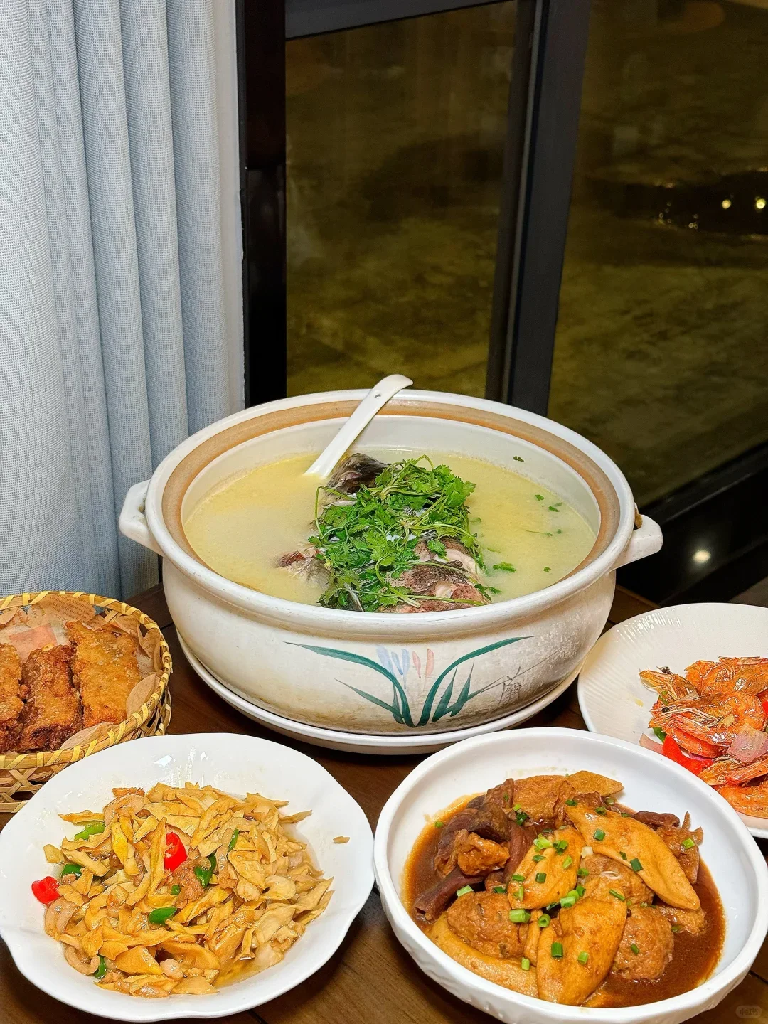 招牌砂锅鱼头现炖,汤色奶白鲜醇,配乌米饭补碳水。赛后解馋补能首选