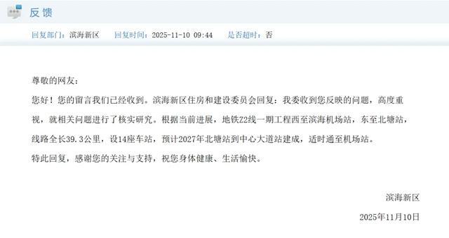 滨海新区政府回复:根据当前进展,地铁Z2线一期工程西至滨海机场站,东至北塘站,线路全长39.3公里,设14座车站,预计2027年北塘站到中心大道站建成,适时通至机场站。