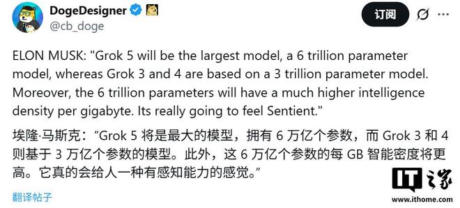 IT之家11月15日消息,科技媒体TheInformation昨日(11月14日)发布博文,报道称马斯克旗下的xAI公司计划推迟到2026年推出Grok5模型,该AI模型将拥有6万亿个参数,是当前Grok3、Grok4规模的两倍。