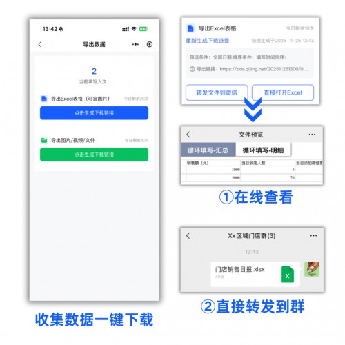 各门店点开群里的链接,即可开始填写数据,数字、照片等均可轻松收集,极简操作流程,会用手机就会用,操作0门槛。